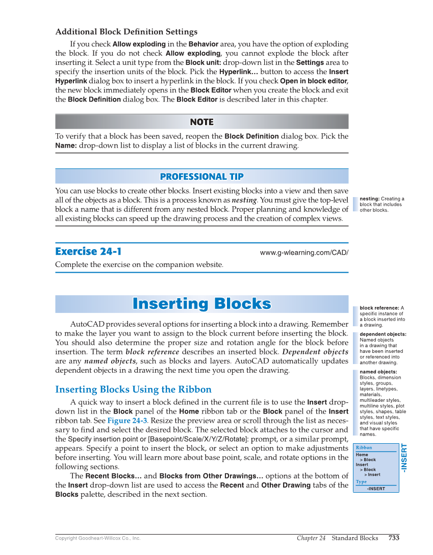 Chapter 24 Standard Blocks 733 Copyright Goodheart-Willcox Co., Inc. Additional Block Defi nition Settings If you check Allow exploding in the Behavior area, you have the option of exploding the block. If you do not check Allow exploding, you cannot explode the block after inserting it. Select a unit type from the Block unit: drop-down list in the Settings area to specify the insertion units of the block. Pick the Hyperlink… button to access the Insert Hyperlink dialog box to insert a hyperlink in the block. If you check Open in block editor, the new block immediately opens in the Block Editor when you create the block and exit the Block Definition dialog box. The Block Editor is described later in this chapter. NOTE NOTE To verify that a block has been saved, reopen the Block Definition dialog box. Pick the Name: drop-down list to display a list of blocks in the current drawing. PROFESSIONAL TIP P R OFESSIONAL TIP You can use blocks to create other blocks. Insert existing blocks into a view and then save all of the objects as a block. This is a process known as nesting. You must give the top-level block a name that is different from any nested block. Proper planning and knowledge of all existing blocks can speed up the drawing process and the creation of complex views. Exercise 24-1 www.g-wlearning.com/CAD/ Complete the exercise on the companion website. Inserting Blocks In s erting Block s AutoCAD provides several options for inserting a block into a drawing. Remember to make the layer you want to assign to the block current before inserting the block. You should also determine the proper size and rotation angle for the block before insertion. The term block reference describes an inserted block. Dependent objects are any named objects, such as blocks and layers. AutoCAD automatically updates dependent objects in a drawing the next time you open the drawing. Inserting Blocks Using the Ribbon A quick way to insert a block defi ned in the current fi le is to use the Insert drop- down list in the Block panel of the Home ribbon tab or the Block panel of the Insert ribbon tab. See Figure 24-3. Resize the preview area or scroll through the list as neces- sary to fi nd and select the desired block. The selected block attaches to the cursor and the Specify insertion point or [Basepoint/Scale/X/Y/Z/Rotate]: prompt, or a similar prompt, appears. Specify a point to insert the block, or select an option to make adjustments before inserting. You will learn more about base point, scale, and rotate options in the following sections. The Recent Blocks… and Blocks from Other Drawings… options at the bottom of the Insert drop-down list are used to access the Recent and Other Drawing tabs of the Blocks palette, described in the next section. nesting: Creating a block that includes other blocks. block reference: A specific instance of a block inserted into a drawing. dependent objects: Named objects in a drawing that have been inserted or referenced into another drawing. named objects: Blocks, dimension styles, groups, layers, linetypes, materials, multileader styles, multiline styles, plot styles, shapes, table styles, text styles, and visual styles that have specific names. -INSERT Ribbon Home Block Insert Block Insert Type -INSERT