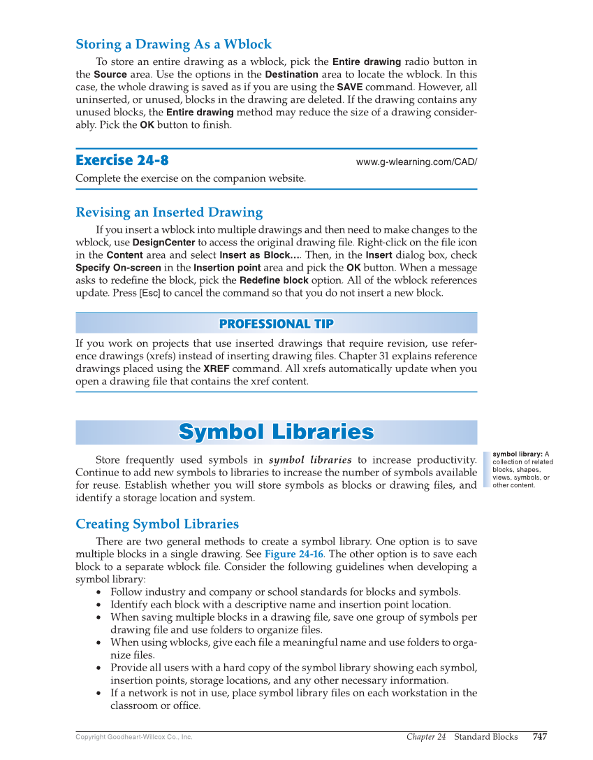 Chapter 24 Standard Blocks 747 Copyright Goodheart-Willcox Co., Inc. Storing a Drawing As a Wblock To store an entire drawing as a wblock, pick the Entire drawing radio button in the Source area. Use the options in the Destination area to locate the wblock. In this case, the whole drawing is saved as if you are using the SAVE command. However, all uninserted, or unused, blocks in the drawing are deleted. If the drawing contains any unused blocks, the Entire drawing method may reduce the size of a drawing consider- ably. Pick the OK button to fi nish. Exercise 24-8 www.g-wlearning.com/CAD/ Complete the exercise on the companion website. Revising an Inserted Drawing If you insert a wblock into multiple drawings and then need to make changes to the wblock, use DesignCenter to access the original drawing fi le. Right-click on the fi le icon in the Content area and select Insert as Block…. Then, in the Insert dialog box, check Specify On-screen in the Insertion point area and pick the OK button. When a message asks to redefi ne the block, pick the Redefine block option. All of the wblock references update. Press [Esc] to cancel the command so that you do not insert a new block. PROFESSIONAL TIP P R OFESSIONAL TIP If you work on projects that use inserted drawings that require revision, use refer- ence drawings (xrefs) instead of inserting drawing fi les. Chapter 31 explains reference drawings placed using the XREF command. All xrefs automatically update when you open a drawing fi le that contains the xref content. Symbol Libraries Symbol Libr a rie s Store frequently used symbols in symbol libraries to increase productivity. Continue to add new symbols to libraries to increase the number of symbols available for reuse. Establish whether you will store symbols as blocks or drawing fi les, and identify a storage location and system. Creating Symbol Libraries There are two general methods to create a symbol library. One option is to save multiple blocks in a single drawing. See Figure 24-16. The other option is to save each block to a separate wblock fi le. Consider the following guidelines when developing a symbol library: • Follow industry and company or school standards for blocks and symbols. • Identify each block with a descriptive name and insertion point location. • When saving multiple blocks in a drawing fi le, save one group of symbols per drawing fi le and use folders to organize fi les. • When using wblocks, give each fi le a meaningful name and use folders to orga- nize fi les. • Provide all users with a hard copy of the symbol library showing each symbol, insertion points, storage locations, and any other necessary information. • If a network is not in use, place symbol library fi les on each workstation in the classroom or offi ce. symbol library: A collection of related blocks, shapes, views, symbols, or other content.