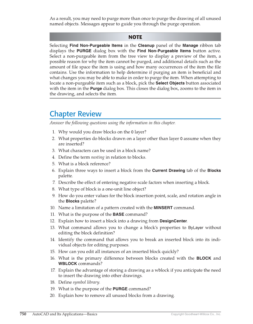 750 AutoCAD and Its Applications—Basics Copyright Goodheart-Willcox Co., Inc. As a result, you may need to purge more than once to purge the drawing of all unused named objects. Messages appear to guide you through the purge operation. NOTE NOTE Selecting Find Non-Purgeable Items in the Cleanup panel of the Manage ribbon tab displays the PURGE dialog box with the Find Non-Purgeable Items button active. Select a non-purgeable item from the tree view to display a preview of the item, a possible reason for why the item cannot be purged, and additional details such as the amount of fi le space the item is using and how many occurrences of the item the fi le contains. Use the information to help determine if purging an item is benefi cial and what changes you may be able to make in order to purge the item. When attempting to locate a non-purgeable item such as a block, pick the Select Objects button associated with the item in the Purge dialog box. This closes the dialog box, zooms to the item in the drawing, and selects the item. Chapter Review Answer the following questions using the information in this chapter. 1. Why would you draw blocks on the 0 layer? 2. What properties do blocks drawn on a layer other than layer 0 assume when they are inserted? 3. What characters can be used in a block name? 4. Define the term nesting in relation to blocks. 5. What is a block reference? 6. Explain three ways to insert a block from the Current Drawing tab of the Blocks palette. 7. Describe the effect of entering negative scale factors when inserting a block. 8. What type of block is a one-unit line object? 9. How do you enter values for the block insertion point, scale, and rotation angle in the Blocks palette? 10. Name a limitation of a pattern created with the MINSERT command. 11. What is the purpose of the BASE command? 12. Explain how to insert a block into a drawing from DesignCenter. 13. What command allows you to change a block’s properties to ByLayer without editing the block definition? 14. Identify the command that allows you to break an inserted block into its indi- vidual objects for editing purposes. 15. How can you edit all instances of an inserted block quickly? 16. What is the primary difference between blocks created with the BLOCK and WBLOCK commands? 17. Explain the advantage of storing a drawing as a wblock if you anticipate the need to insert the drawing into other drawings. 18. Define symbol library. 19. What is the purpose of the PURGE command? 20. Explain how to remove all unused blocks from a drawing.