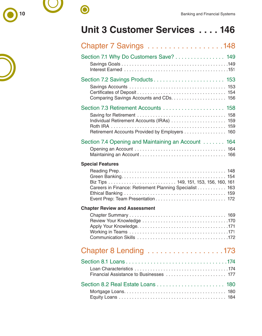 10 Banking and Financial Systems Unit 3 Customer Services . . . . 146 Chapter 7 Savings . . . . . . . . . . . . . . . . . .148 Section 7.1 Why Do Customers Save? . . . . . . . . . . . . . . . . 149 Savings Goals . . . . . . . . . . . . . . . . . . . . . . . . . . . . . . . . . . . . . . . . .149 Interest Earned . . . . . . . . . . . . . . . . . . . . . . . . . . . . . . . . . . . . . . . .151 Section 7.2 Savings Products . . . . . . . . . . . . . . . . . . . . . . . 153 Savings Accounts . . . . . . . . . . . . . . . . . . . . . . . . . . . . . . . . . . . . . 153 Certifi cates of Deposit . . . . . . . . . . . . . . . . . . . . . . . . . . . . . . . . . . 154 Comparing Savings Accounts and CDs. . . . . . . . . . . . . . . . . . . . . 156 Section 7.3 Retirement Accounts . . . . . . . . . . . . . . . . . . . . 158 Saving for Retirement . . . . . . . . . . . . . . . . . . . . . . . . . . . . . . . . . . 158 Individual Retirement Accounts (IRAs) . . . . . . . . . . . . . . . . . . . . . 159 Roth IRA . . . . . . . . . . . . . . . . . . . . . . . . . . . . . . . . . . . . . . . . . . . . 159 Retirement Accounts Provided by Employers . . . . . . . . . . . . . . . . 160 Section 7.4 Opening and Maintaining an Account . . . . . . . 164 Opening an Account . . . . . . . . . . . . . . . . . . . . . . . . . . . . . . . . . . . 164 Maintaining an Account . . . . . . . . . . . . . . . . . . . . . . . . . . . . . . . . . 166 Special Features Reading Prep. . . . . . . . . . . . . . . . . . . . . . . . . . . . . . . . . . . . . . . . . 148 Green Banking. . . . . . . . . . . . . . . . . . . . . . . . . . . . . . . . . . . . . . . . 154 Biz Tips . . . . . . . . . . . . . . . . . . . . . . . . . . 149, 151, 153, 156, 160, 161 Careers in Finance: Retirement Planning Specialist . . . . . . . . . . . 163 Ethical Banking . . . . . . . . . . . . . . . . . . . . . . . . . . . . . . . . . . . . . . . 159 Event Prep: Team Presentation . . . . . . . . . . . . . . . . . . . . . . . . . . . 172 Chapter Review and Assessment Chapter Summary . . . . . . . . . . . . . . . . . . . . . . . . . . . . . . . . . . . . . 169 Review Your Knowledge . . . . . . . . . . . . . . . . . . . . . . . . . . . . . . . . .170 Apply Your Knowledge. . . . . . . . . . . . . . . . . . . . . . . . . . . . . . . . . . .171 Working in Teams . . . . . . . . . . . . . . . . . . . . . . . . . . . . . . . . . . . . . .171 Communication Skills . . . . . . . . . . . . . . . . . . . . . . . . . . . . . . . . . . .172 Chapter 8 Lending . . . . . . . . . . . . . . . . . .173 Section 8.1 Loans . . . . . . . . . . . . . . . . . . . . . . . . . . . . . . . . .174 Loan Characteristics . . . . . . . . . . . . . . . . . . . . . . . . . . . . . . . . . . . .174 Financial Assistance to Businesses . . . . . . . . . . . . . . . . . . . . . . . 177 Section 8.2 Real Estate Loans . . . . . . . . . . . . . . . . . . . . . . 180 Mortgage Loans. . . . . . . . . . . . . . . . . . . . . . . . . . . . . . . . . . . . . . . 180 Equity Loans . . . . . . . . . . . . . . . . . . . . . . . . . . . . . . . . . . . . . . . . . 184
