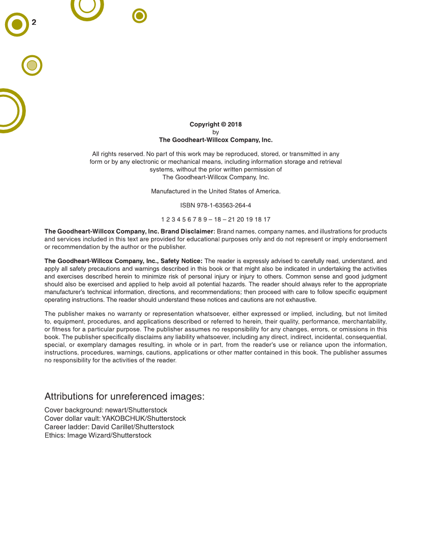 2 Copyright © 2018 by The Goodheart-Willcox Company, Inc. All rights reserved. No part of this work may be reproduced, stored, or transmitted in any form or by any electronic or mechanical means, including information storage and retrieval systems, without the prior written permission of The Goodheart-Willcox Company, Inc. Manufactured in the United States of America. ISBN 978-1-63563-264-4 1 2 3 4 5 6 7 8 9 – 18 – 21 20 19 18 17 The Goodheart-Willcox Company, Inc. Brand Disclaimer: Brand names, company names, and illustrations for products and services included in this text are provided for educational purposes only and do not represent or imply endorsement or recommendation by the author or the publisher. The Goodheart-Willcox Company, Inc., Safety Notice: The reader is expressly advised to carefully read, understand, and apply all safety precautions and warnings described in this book or that might also be indicated in undertaking the activities and exercises described herein to minimize risk of personal injury or injury to others. Common sense and good judgment should also be exercised and applied to help avoid all potential hazards. The reader should always refer to the appropriate manufacturer’s technical information, directions, and recommendations then proceed with care to follow specifi equipment fic operating instructions. The reader should understand these notices and cautions are not exhaustive. The publisher makes no warranty or representation whatsoever, either expressed or implied, including, but not limited to, equipment, procedures, and applications described or referred to herein, their quality, performance, merchantability, or fi tness for a particular purpose. The publisher assumes no responsibility for any changes, errors, or omissions in this book. The publisher specifi cally disclaims any liability whatsoever, including any direct, indirect, incidental, consequential, special, or exemplary damages resulting, in whole or in part, from the reader’s use or reliance upon the information, instructions, procedures, warnings, cautions, applications or other matter contained in this book. The publisher assumes no responsibility for the activities of the reader. Attributions for unreferenced images: Cover background: newart/Shutterstock Cover dollar vault: YAKOBCHUK/Shutterstock Career ladder: David Carillet/Shutterstock Ethics: Image Wizard/Shutterstock