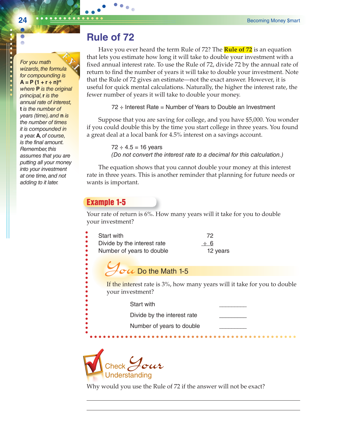 fi xed annual interest rate. To use the Rule of 72, divide 72 by the annual rate of