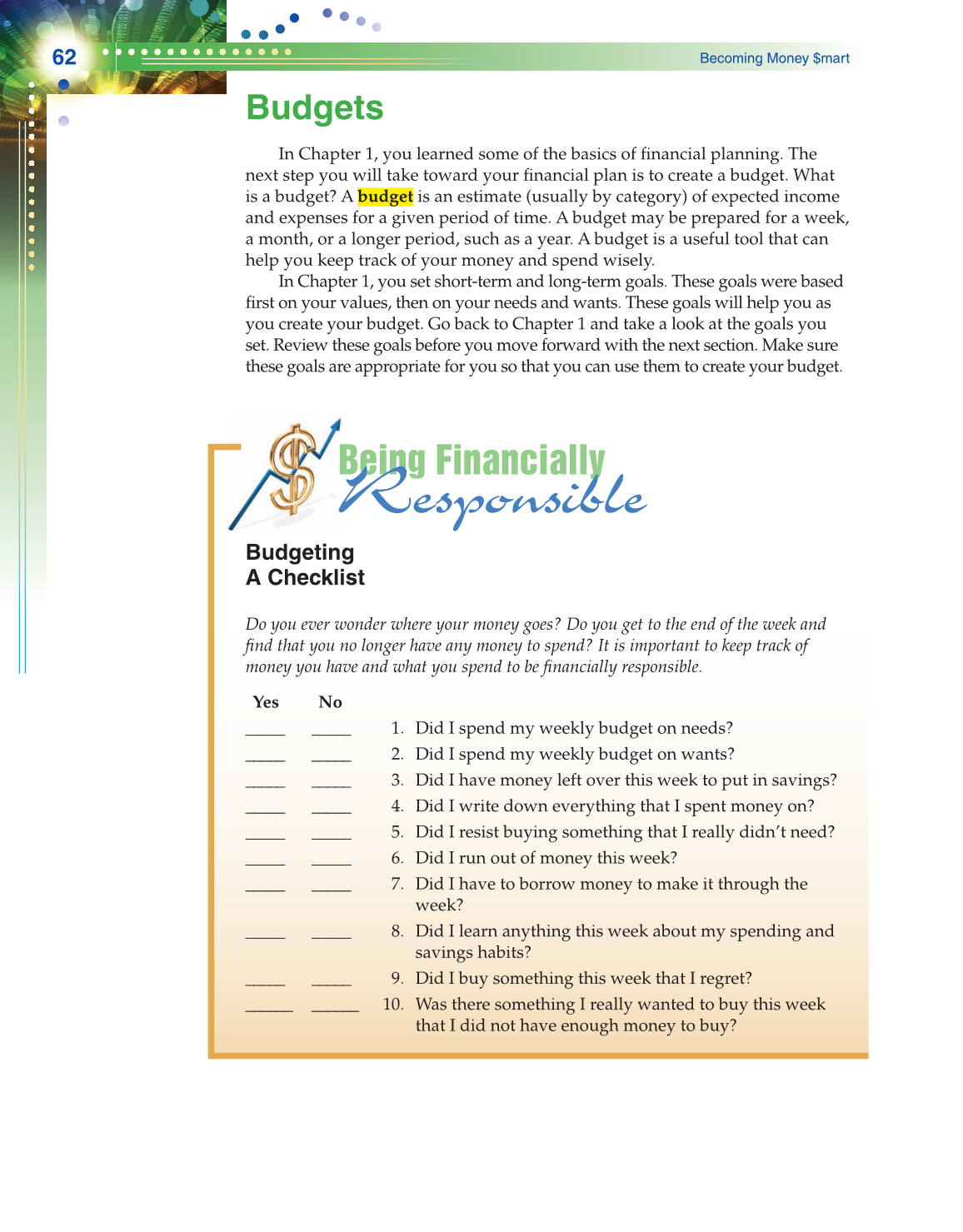 _____ _____ 2. Did I spend my weekly budget on wants?