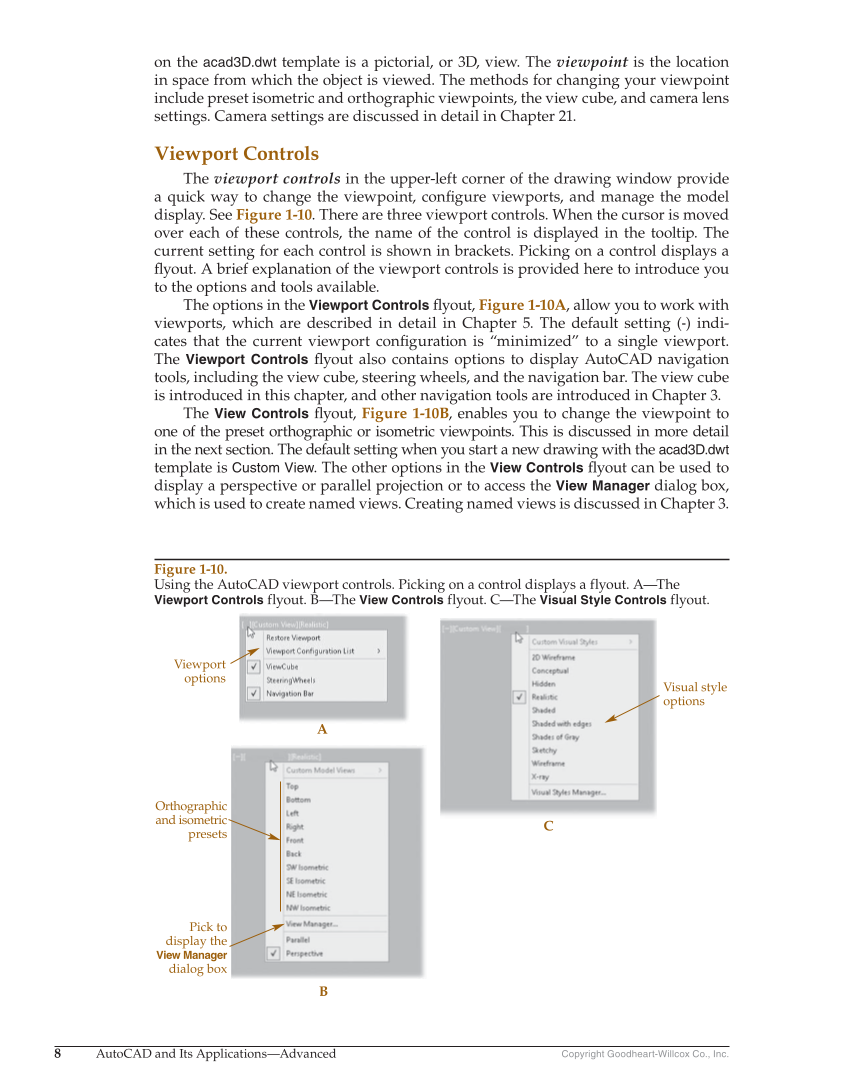 8 AutoCAD and Its Applications—Advanced Copyright Goodheart-Willcox Co., Inc. on the acad3D.dwt template is a pictorial, or 3D, view. The viewpoint is the location in space from which the object is viewed. The methods for changing your viewpoint include preset isometric and orthographic viewpoints, the view cube, and camera lens settings. Camera settings are discussed in detail in Chapter 21. Viewport Controls The viewport controls in the upper-left corner of the drawing window provide a quick way to change the viewpoint, confi gure viewports, and manage the model display. See Figure 1-10. There are three viewport controls. When the cursor is moved over each of these controls, the name of the control is displayed in the tooltip. The current setting for each control is shown in brackets. Picking on a control displays a fl yout. A brief explanation of the viewport controls is provided here to introduce you to the options and tools available. The options in the Viewport Controls fl yout, Figure 1-10A, allow you to work with viewports, which are described in detail in Chapter 5. The default setting (-) indi- cates that the current viewport confi guration is “minimized” to a single viewport. The Viewport Controls fl yout also contains options to display AutoCAD navigation tools, including the view cube, steering wheels, and the navigation bar. The view cube is introduced in this chapter, and other navigation tools are introduced in Chapter 3. The View Controls fl yout, Figure 1-10B, enables you to change the viewpoint to one of the preset orthographic or isometric viewpoints. This is discussed in more detail in the next section. The default setting when you start a new drawing with the acad3D.dwt template is Custom View. The other options in the View Controls fl yout can be used to display a perspective or parallel projection or to access the View Manager dialog box, which is used to create named views. Creating named views is discussed in Chapter 3. C B A Visual style options Viewport options Orthographic and isometric presets Pick to display the View Manager dialog box Figure 1-10. Using the AutoCAD viewport controls. Picking on a control displays a flyout. A—The Viewport Controls flyout. B—The View Controls flyout. C—The Visual Style Controls flyout.