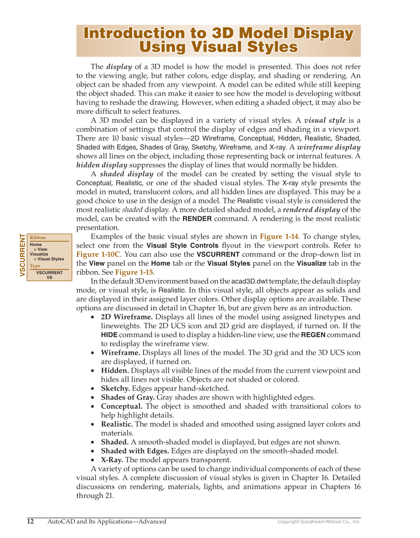 12 AutoCAD and Its Applications—Advanced Copyright Goodheart-Willcox Co., Inc. Introduction to 3D Model Display Introduction to 3D Model Display Using Visual Styles Using Visual Styles The display of a 3D model is how the model is presented. This does not refer to the viewing angle, but rather colors, edge display, and shading or rendering. An object can be shaded from any viewpoint. A model can be edited while still keeping the object shaded. This can make it easier to see how the model is developing without having to reshade the drawing. However, when editing a shaded object, it may also be more diffi cult to select features. A 3D model can be displayed in a variety of visual styles. A visual style is a combination of settings that control the display of edges and shading in a viewport. There are 10 basic visual styles—2D Wireframe, Conceptual, Hidden, Realistic, Shaded, Shaded with Edges, Shades of Gray, Sketchy, Wireframe, and X-ray. A wireframe display shows all lines on the object, including those representing back or internal features. A hidden display suppresses the display of lines that would normally be hidden. A shaded display of the model can be created by setting the visual style to Conceptual, Realistic, or one of the shaded visual styles. The X-ray style presents the model in muted, translucent colors, and all hidden lines are displayed. This may be a good choice to use in the design of a model. The Realistic visual style is considered the most realistic shaded display. A more detailed shaded model, a rendered display of the model, can be created with the RENDER command. A rendering is the most realistic presentation. Examples of the basic visual styles are shown in Figure 1-14. To change styles, select one from the Visual Style Controls fl yout in the viewport controls. Refer to Figure 1-10C. You can also use the VSCURRENT command or the drop-down list in the View panel on the Home tab or the Visual Styles panel on the Visualize tab in the ribbon. See Figure 1-15. In the default 3D environment based on the acad3D.dwt template, the default display mode, or visual style, is Realistic. In this visual style, all objects appear as solids and are displayed in their assigned layer colors. Other display options are available. These options are discussed in detail in Chapter 16, but are given here as an introduction. • 2D Wireframe. Displays all lines of the model using assigned linetypes and lineweights. The 2D UCS icon and 2D grid are displayed, if turned on. If the HIDE command is used to display a hidden-line view, use the REGEN command to redisplay the wireframe view. • Wireframe. Displays all lines of the model. The 3D grid and the 3D UCS icon are displayed, if turned on. • Hidden. Displays all visible lines of the model from the current viewpoint and hides all lines not visible. Objects are not shaded or colored. • Sketchy. Edges appear hand-sketched. • Shades of Gray. Gray shades are shown with highlighted edges. • Conceptual. The object is smoothed and shaded with transitional colors to help highlight details. • Realistic. The model is shaded and smoothed using assigned layer colors and materials. • Shaded. A smooth-shaded model is displayed, but edges are not shown. • Shaded with Edges. Edges are displayed on the smooth-shaded model. • X-Ray. The model appears transparent. A variety of options can be used to change individual components of each of these visual styles. A complete discussion of visual styles is given in Chapter 16. Detailed discussions on rendering, materials, lights, and animations appear in Chapters 16 through 21. VSCURRENT Ribbon Home View Visualize Visual Styles Type VSCURRENT VS