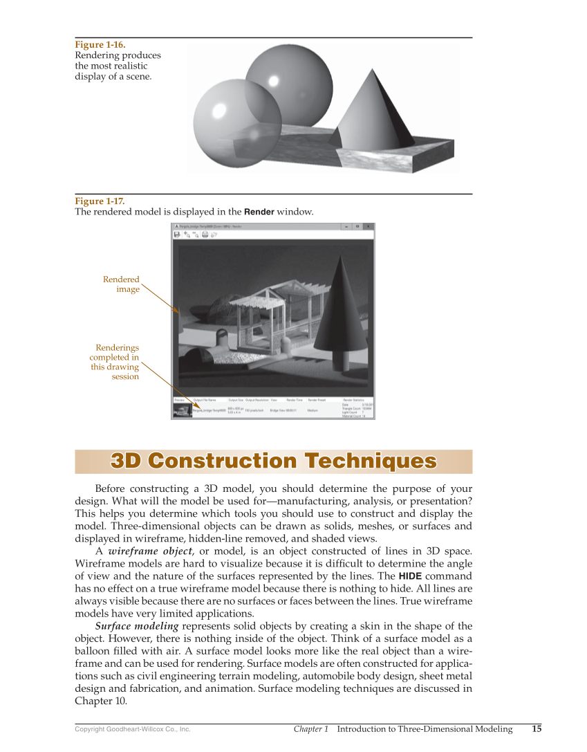 Chapter 1 Introduction to Three-Dimensional Modeling 15 Copyright Goodheart-Willcox Co., Inc. 3D Construction Techniques 3D Construction Techniques Before constructing a 3D model, you should determine the purpose of your design. What will the model be used for—manufacturing, analysis, or presentation? This helps you determine which tools you should use to construct and display the model. Three-dimensional objects can be drawn as solids, meshes, or surfaces and displayed in wireframe, hidden-line removed, and shaded views. A wireframe object, or model, is an object constructed of lines in 3D space. Wireframe models are hard to visualize because it is diffi cult to determine the angle of view and the nature of the surfaces represented by the lines. The HIDE command has no effect on a true wireframe model because there is nothing to hide. All lines are always visible because there are no surfaces or faces between the lines. True wireframe models have very limited applications. Surface modeling represents solid objects by creating a skin in the shape of the object. However, there is nothing inside of the object. Think of a surface model as a balloon fi lled with air. A surface model looks more like the real object than a wire- frame and can be used for rendering. Surface models are often constructed for applica- tions such as civil engineering terrain modeling, automobile body design, sheet metal design and fabrication, and animation. Surface modeling techniques are discussed in Chapter 10. Rendered image Renderings completed in this drawing session Figure 1-17. The rendered model is displayed in the Render window. Figure 1-16. Rendering produces the most realistic display of a scene.