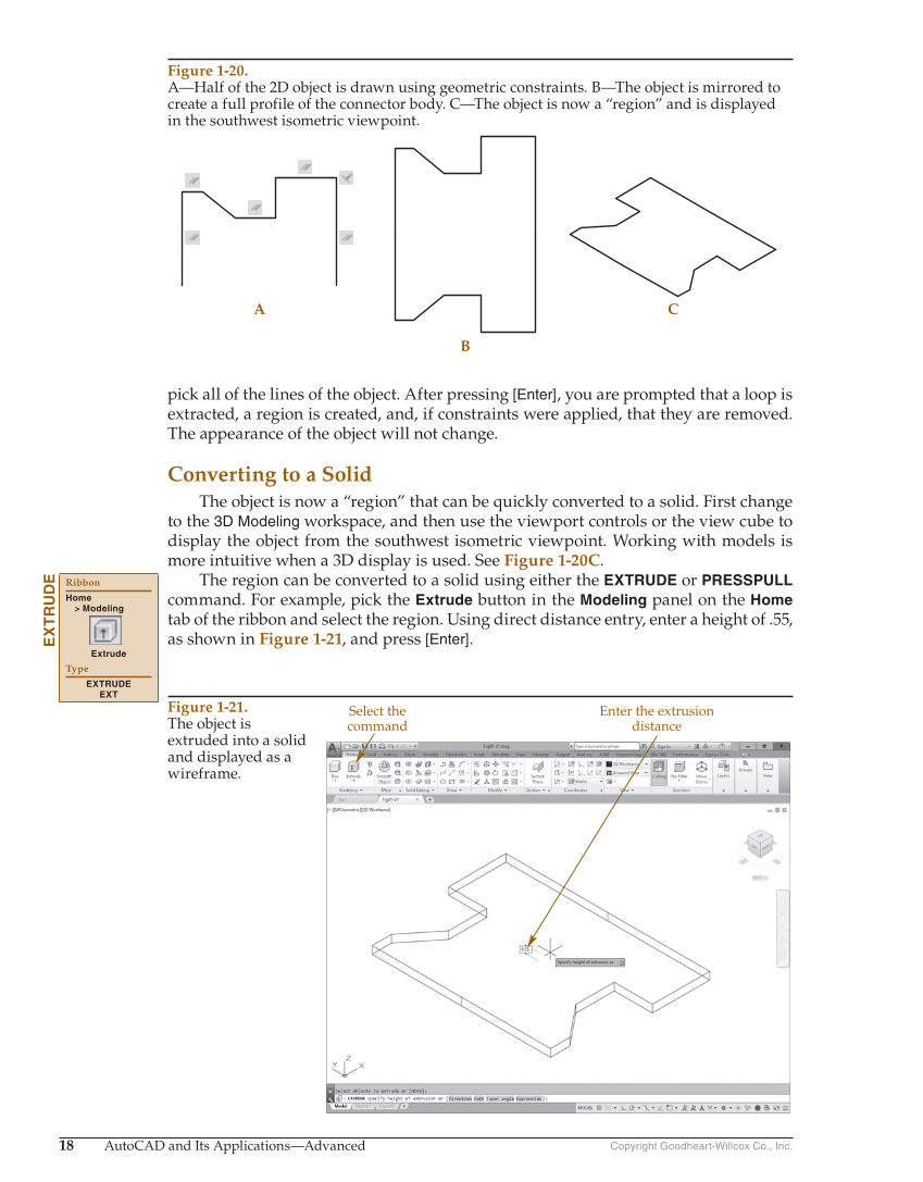 18 AutoCAD and Its Applications—Advanced Copyright Goodheart-Willcox Co., Inc. pick all of the lines of the object. After pressing [Enter], you are prompted that a loop is extracted, a region is created, and, if constraints were applied, that they are removed. The appearance of the object will not change. Converting to a Solid The object is now a “region” that can be quickly converted to a solid. First change to the 3D Modeling workspace, and then use the viewport controls or the view cube to display the object from the southwest isometric viewpoint. Working with models is more intuitive when a 3D display is used. See Figure 1-20C. The region can be converted to a solid using either the EXTRUDE or PRESSPULL command. For example, pick the Extrude button in the Modeling panel on the Home tab of the ribbon and select the region. Using direct distance entry, enter a height of .55, as shown in Figure 1-21, and press [Enter]. EXTRUDE Ribbon Home Modeling Extrude Type EXTRUDE EXT B A C Figure 1-20. A—Half of the 2D object is drawn using geometric constraints. B—The object is mirrored to create a full profile of the connector body. C—The object is now a “region” and is displayed in the southwest isometric viewpoint. Enter the extrusion distance Select the command Figure 1-21. The object is extruded into a solid and displayed as a wireframe.