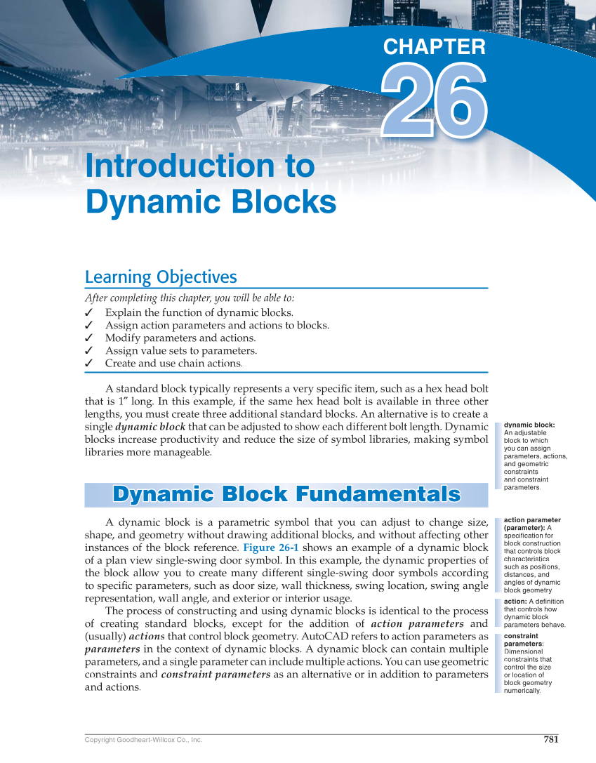 781 Copyright Goodheart-Willcox Co., Inc. Learning Objectives will be able to: After completing this chapter, you u ✓ namic blocks. Explain the function of d yn ✓ and actions to blocks. Assign action parameters a ✓ y parameters Modi fy p and actions. c ✓ Assign value sets to parameters. ✓ Create and use chain actions. A standard block typically represents a very specific item, such as a hex head bolt fi that is 1″ long. In this example, if the same hex head bolt is available in three other ″ lengths, you must create three additional standard blocks. An alternative is to create a single dynamic block that can be adjusted to show each different bolt length. Dynamic blocks increase productivity and reduce the size of symbol libraries, making symbol libraries more manageable. Dynamic Block Fundamentals Dyn a mic Block Fund a ment a l s A dynamic block is a parametric symbol that you can adjust to change size, shape, and geometry without drawing additional blocks, and without affecting other instances of the block reference. Figure 26-1 shows an example of a dynamic block of a plan view single-swing door symbol. In this example, the dynamic properties of the block allow you to create many different single-swing door symbols according to specifi parameters, such as door size, wall thickness, swing location, swing angle fic representation, wall angle, and exterior or interior usage. The process of constructing and using dynamic blocks is identical to the process of creating standard blocks, except for the addition of action parameters and (usually) actions that control block geometry. AutoCAD refers to action parameters as parameters in the context of dynamic blocks. A dynamic block can contain multiple parameters, and a single parameter can include multiple actions. You can use geometric constraints and constraint parameters as an alternative or in addition to parameters and actions. dynamic block: An adjustable block to which you can assign parameters, actions, and geometric constraints and constraint parameters. action parameter (parameter): A specification for block construction that controls block characteristics such as positions, distances, and angles of dynamic block geometry. action: A definition that controls how dynamic block parameters behave. constraint parameters: Dimensional constraints that control the size or location of block geometry numerically. Introduction to Dynamic Blocks 26CHAPTER 26