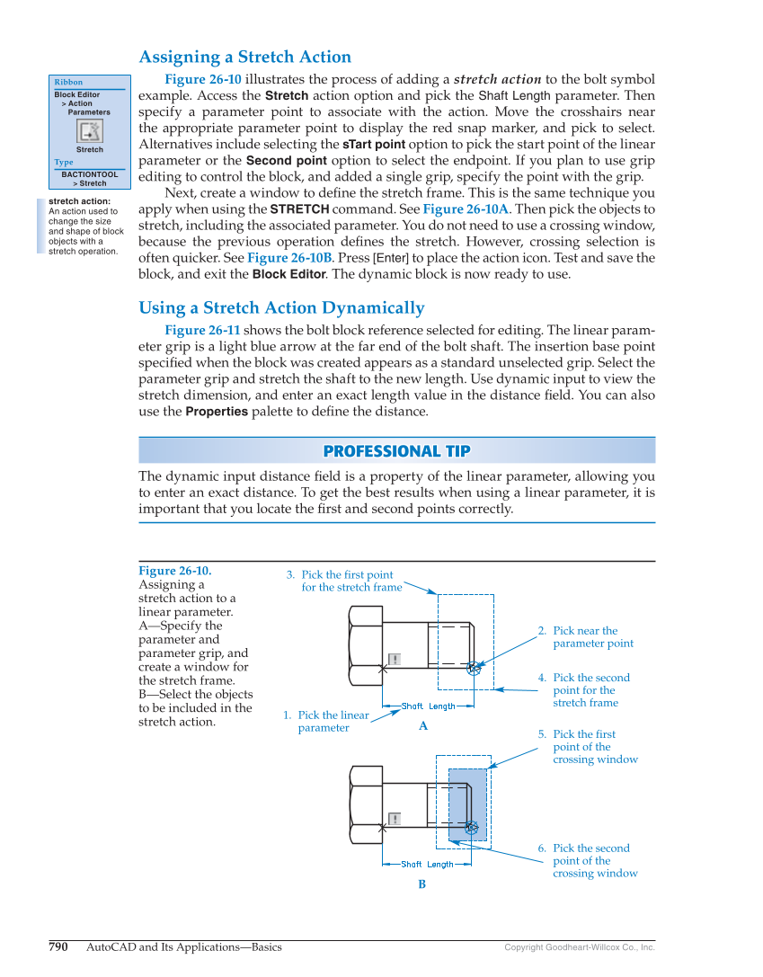 790 AutoCAD and Its Applications—Basics Copyright Goodheart-Willcox Co., Inc. Assigning a Stretch Action Figure 26-10 illustrates the process of adding a stretch action to the bolt symbol example. Access the Stretch action option and pick the Shaft Length parameter. Then specify a parameter point to associate with the action. Move the crosshairs near the appropriate parameter point to display the red snap marker, and pick to select. Alternatives include selecting the sTart point option to pick the start point of the linear parameter or the Second point option to select the endpoint. If you plan to use grip editing to control the block, and added a single grip, specify the point with the grip. Next, create a window to defi ne the stretch frame. This is the same technique you apply when using the STRETCH command. See Figure 26-10A. Then pick the objects to stretch, including the associated parameter. You do not need to use a crossing window, because the previous operation defi nes the stretch. However, crossing selection is often quicker. See Figure 26-10B. Press [Enter] to place the action icon. Test and save the block, and exit the Block Editor. The dynamic block is now ready to use. Using a Stretch Action Dynamically Figure 26-11 shows the bolt block reference selected for editing. The linear param- eter grip is a light blue arrow at the far end of the bolt shaft. The insertion base point specifi ed when the block was created appears as a standard unselected grip. Select the parameter grip and stretch the shaft to the new length. Use dynamic input to view the stretch dimension, and enter an exact length value in the distance fi eld. You can also use the Properties palette to defi ne the distance. PROFESSIONAL TIP P R OFESSIONAL TIP The dynamic input distance fi eld is a property of the linear parameter, allowing you to enter an exact distance. To get the best results when using a linear parameter, it is important that you locate the fi rst and second points correctly. Ribbon Block Editor Action Parameters Stretch Type BACTIONTOOL Stretch stretch action: An action used to change the size and shape of block objects with a stretch operation. Figure 26-10. Assigning a stretch action to a linear parameter. A—Specify the parameter and parameter grip, and create a window for the stretch frame. B—Select the objects to be included in the stretch action. 2. Pick near the parameter point 4. Pick the second point for the stretch frame 5. Pick the first point of the crossing window 6. Pick the second point of the crossing window 3. Pick the first point for the stretch frame 1. Pick the linear parameter A B