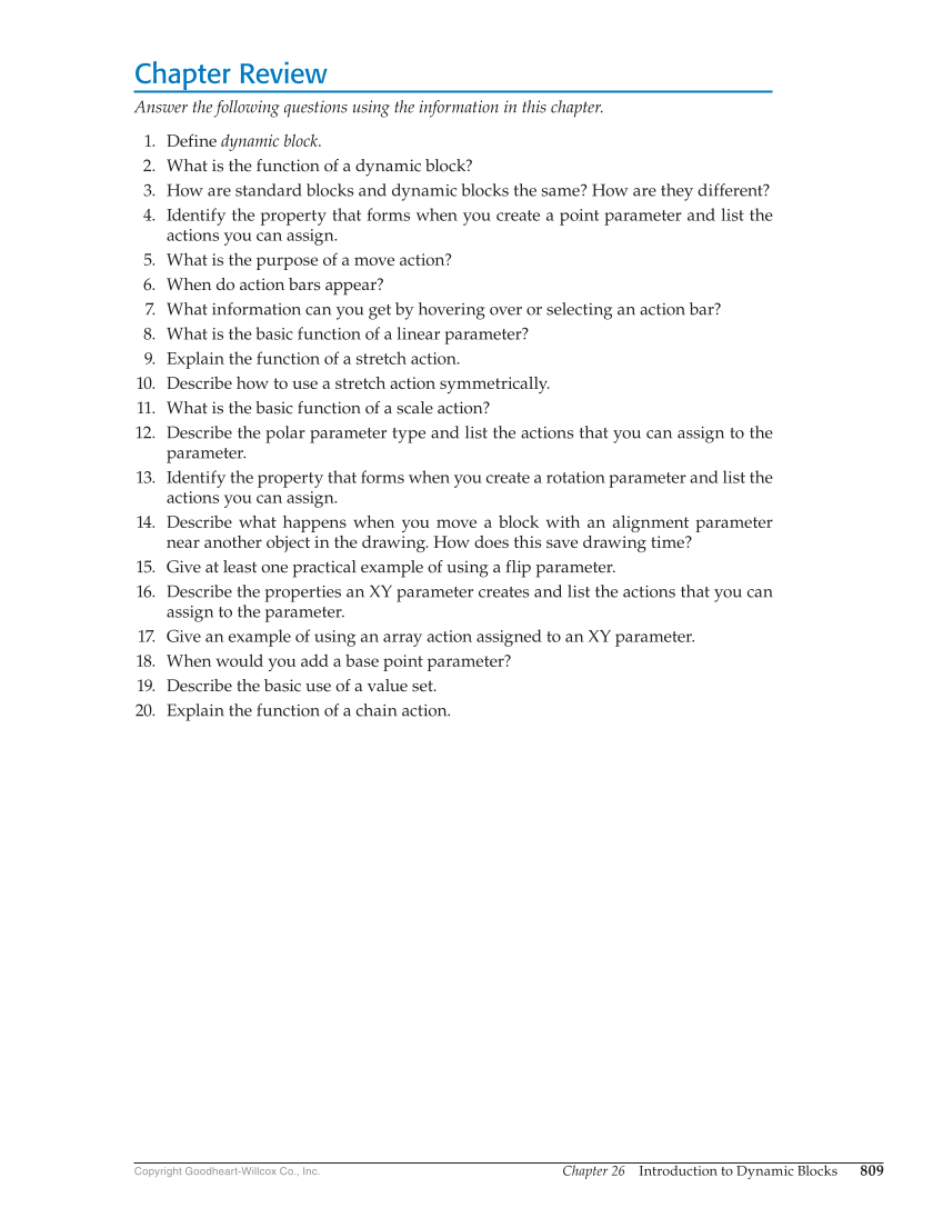 Chapter 26 Introduction to Dynamic Blocks 809 Copyright Goodheart-Willcox Co., Inc. Chapter Review Answer the following questions using the information in this chapter. 1. Define dynamic block. 2. What is the function of a dynamic block? 3. How are standard blocks and dynamic blocks the same? How are they different? 4. Identify the property that forms when you create a point parameter and list the actions you can assign. 5. What is the purpose of a move action? 6. When do action bars appear? 7. What information can you get by hovering over or selecting an action bar? 8. What is the basic function of a linear parameter? 9. Explain the function of a stretch action. 10. Describe how to use a stretch action symmetrically. 11. What is the basic function of a scale action? 12. Describe the polar parameter type and list the actions that you can assign to the parameter. 13. Identify the property that forms when you create a rotation parameter and list the actions you can assign. 14. Describe what happens when you move a block with an alignment parameter near another object in the drawing. How does this save drawing time? 15. Give at least one practical example of using a flip parameter. 16. Describe the properties an XY parameter creates and list the actions that you can assign to the parameter. 17. Give an example of using an array action assigned to an XY parameter. 18. When would you add a base point parameter? 19. Describe the basic use of a value set. 20. Explain the function of a chain action.
