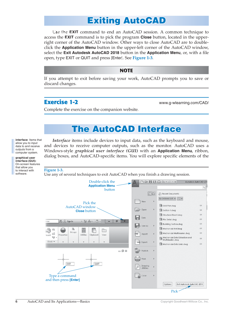 6 AutoCAD and Its Applications—Basics Copyright Goodheart-Willcox Co., Inc. Exiting AutoCAD Exiting AutoCAD EXIT command to end an AutoCAD session. A common technique to access the EXIT command is to pick the program Close button, located in the upper- right corner of the AutoCAD window. Other ways to close AutoCAD are to double- click the Application Menu button in the upper-left corner of the AutoCAD window, select the Exit Autodesk AutoCAD 2018 button in the Application Menu, or, with a file fi open, type EXIT or QUIT and press [Enter]. See Figure 1-3. NOTE O T N O O T OT OT TE If you attempt to exit before saving your work, AutoCAD prompts you to save or discard changes. Exercise 1-2 www.g-wlearning.com/CAD/ Complete the exercise on the companion website. The AutoCAD Interface The AutoCAD Interf a ce Interface items include devices to input data, such as the keyboard and mouse, and devices to receive computer outputs, such as the monitor. AutoCAD uses a Windows-style graphical user interface (GUI) with an Application Menu, ribbon, dialog boxes, and AutoCAD-specific items. You will explore specific fi elements of the fi interface: Items that allow you to input data to and receive outputs from a computer system. graphical user interface (GUI): On-screen features that allow you to interact with software. Figure 1-3. Use any of several techniques to exit AutoCAD when you finish a drawing session. Pick the AutoCAD window Close button Double-click the Application Menu button Pick Type a command and then press [Enter]
