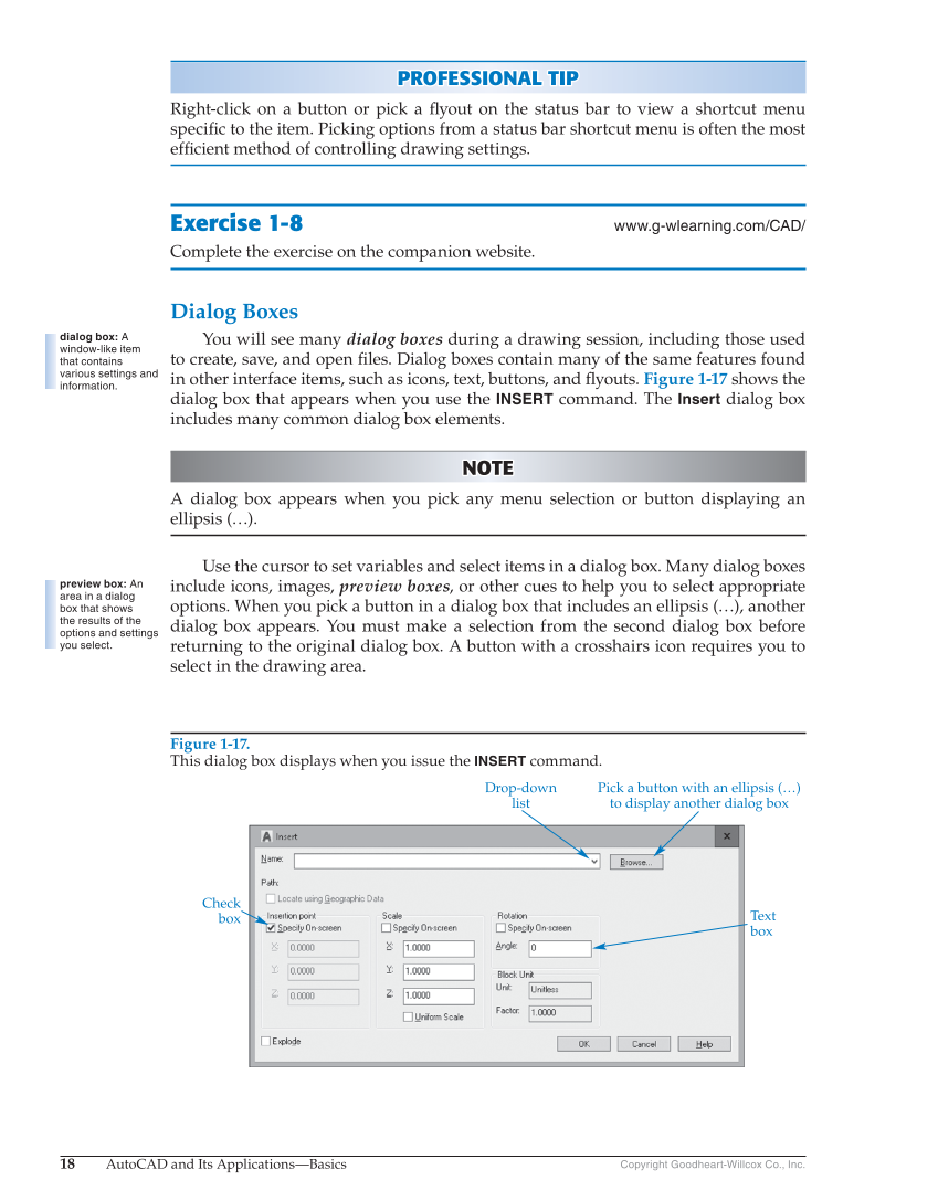 18 AutoCAD and Its Applications—Basics Copyright Goodheart-Willcox Co., Inc. PROFESSIONAL TIP P R OFESSIONAL TIP Right-click on a button or pick a fl yout on the status bar to view a shortcut menu specifi c to the item. Picking options from a status bar shortcut menu is often the most effi cient method of controlling drawing settings. Exercise 1-8 www.g-wlearning.com/CAD/ Complete the exercise on the companion website. Dialog Boxes You will see many dialog boxes during a drawing session, including those used to create, save, and open fi les. Dialog boxes contain many of the same features found in other interface items, such as icons, text, buttons, and fl youts. Figure 1-17 shows the dialog box that appears when you use the INSERT command. The Insert dialog box includes many common dialog box elements. NOTE NOTE A dialog box appears when you pick any menu selection or button displaying an ellipsis (…). Use the cursor to set variables and select items in a dialog box. Many dialog boxes include icons, images, preview boxes, or other cues to help you to select appropriate options. When you pick a button in a dialog box that includes an ellipsis (…), another dialog box appears. You must make a selection from the second dialog box before returning to the original dialog box. A button with a crosshairs icon requires you to select in the drawing area. dialog box: A window-like item that contains various settings and information. preview box: An area in a dialog box that shows the results of the options and settings you select. Figure 1-17. This dialog box displays when you issue the INSERT command. Drop-down list Pick a button with an ellipsis (…) to display another dialog box Text box Check box
