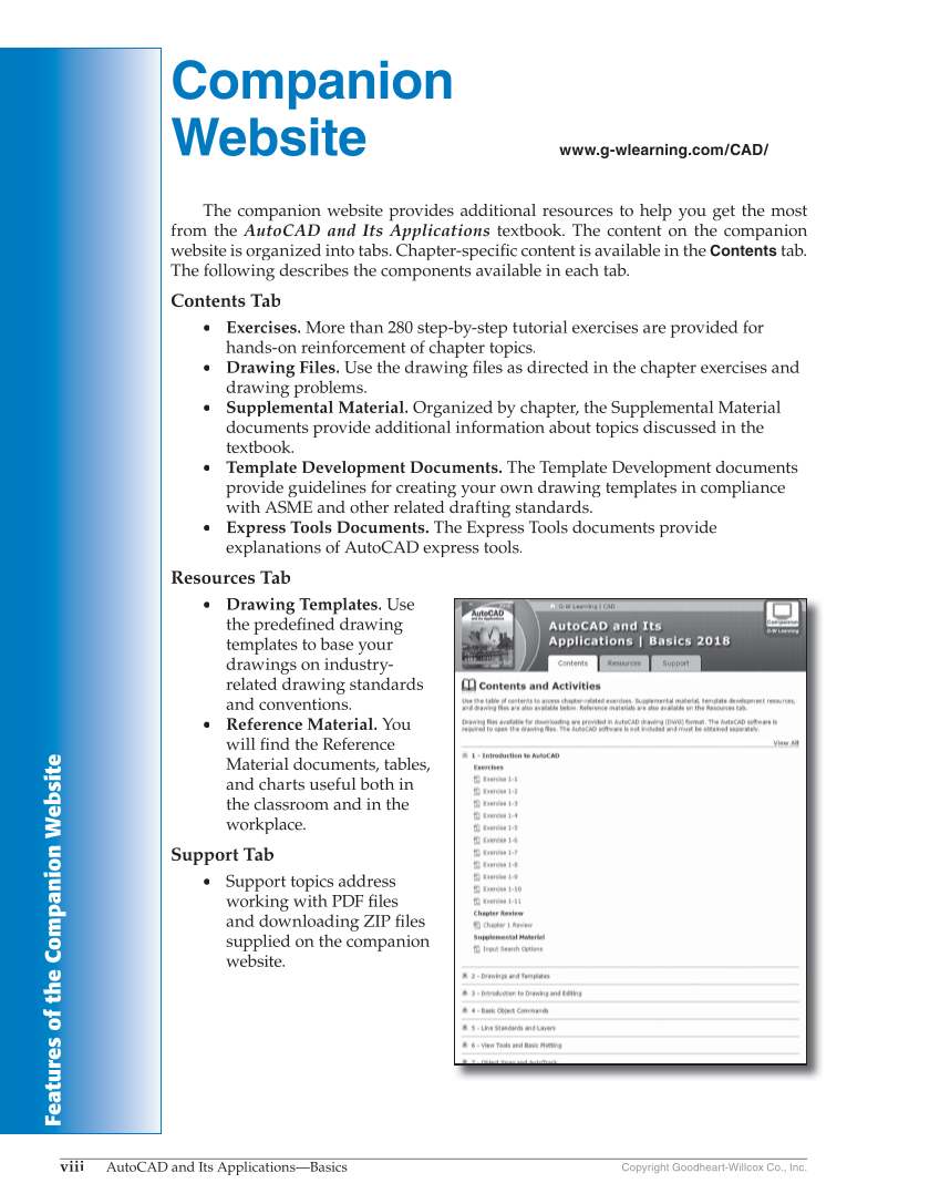 Drawing Problems - Chapter 1 Features of the Companion Website viii AutoCAD and Its Applications—Basics Copyright Goodheart-Willcox Co., Inc. Companion Website www.g-wlearning.com/CAD/ The companion website provides additional resources to help you get the most from the AutoCAD and Its Applications textbook. The content on the companion website is organized into tabs. Chapter-specific content is available in the fi Contents tab. The following describes the components available in each tab. Contents Tab • Exercises. More than 280 step-by-step tutorial exercises are provided for hands-on reinforcement of chapter topics. • Drawing Files. Use the drawing files as directed in the chapter exercises and fi drawing problems. • Supplemental Material. Organized by chapter, the Supplemental Material documents provide additional information about topics discussed in the textbook. • Template Development Documents. The Template Development documents provide guidelines for creating your own drawing templates in compliance with ASME and other related drafting standards. • Express Tools Documents. The Express Tools documents provide explanations of AutoCAD express tools. Resources Tab • Drawing Templates. Use the predefi drawing fined templates to base your drawings on industry- related drawing standards and conventions. • Reference Material. You will fi nd the Reference fi Material documents, tables, and charts useful both in the classroom and in the workplace. Support Tab • Support topics address working with PDF files fi and downloading ZIP files fi supplied on the companion website.