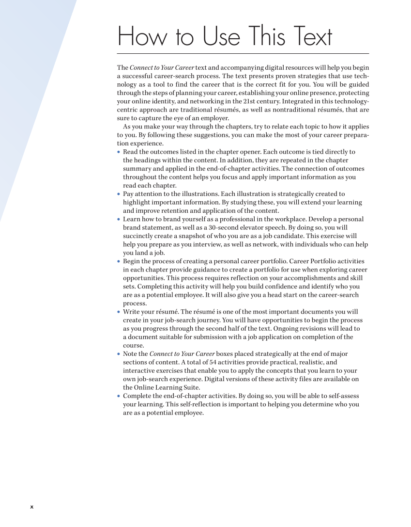 How to Use This Text The Connect to Your Career text and accompanying digital resources will help you begin a successful career-search process. The text presents proven strategies that use tech- nology as a tool to find the career that is the correct fit for you. You will be guided through the steps of planning your career, establishing your online presence, protecting your online identity, and networking in the 21st century. Integrated in this technology- centric approach are traditional résumés, as well as nontraditional résumés, that are sure to capture the eye of an employer. As you make your way through the chapters, try to relate each topic to how it applies to you. By following these suggestions, you can make the most of your career prepara- tion experience. • Read the outcomes listed in the chapter opener. Each outcome is tied directly to the headings within the content. In addition, they are repeated in the chapter summary and applied in the end-of-chapter activities. The connection of outcomes throughout the content helps you focus and apply important information as you read each chapter. • Pay attention to the illustrations. Each illustration is strategically created to highlight important information. By studying these, you will extend your learning and improve retention and application of the content. • Learn how to brand yourself as a professional in the workplace. Develop a personal brand statement, as well as a 30-second elevator speech. By doing so, you will succinctly create a snapshot of who you are as a job candidate. This exercise will help you prepare as you interview, as well as network, with individuals who can help you land a job. • Begin the process of creating a personal career portfolio. Career Portfolio activities in each chapter provide guidance to create a portfolio for use when exploring career opportunities. This process requires reflection on your accomplishments and skill sets. Completing this activity will help you build confidence and identify who you are as a potential employee. It will also give you a head start on the career-search process. • Write your résumé. The résumé is one of the most important documents you will create in your job-search journey. You will have opportunities to begin the process as you progress through the second half of the text. Ongoing revisions will lead to a document suitable for submission with a job application on completion of the course. • Note the Connect to Your Career boxes placed strategically at the end of major sections of content. A total of 54 activities provide practical, realistic, and interactive exercises that enable you to apply the concepts that you learn to your own job-search experience. Digital versions of these activity files are available on the Online Learning Suite. • Complete the end-of-chapter activities. By doing so, you will be able to self-assess your learning. This self-reflection is important to helping you determine who you are as a potential employee. x