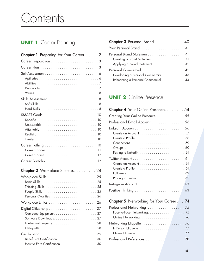 Contents UNIT 1 Career Planning Chapter 1 Preparing for Your Career . . . . . 2 Career Preparation . . . . . . . . . . . . . . . . . . . . . . 3 Career Plan . . . . . . . . . . . . . . . . . . . . . . . . . . . 3 Self-Assessment . . . . . . . . . . . . . . . . . . . . . . . . . 6 Aptitudes . . . . . . . . . . . . . . . . . . . . . . . . . . . . . . . 6 Abilities . . . . . . . . . . . . . . . . . . . . . . . . . . . . . . . . 7 Personality . . . . . . . . . . . . . . . . . . . . . . . . . . . . . . 7 Values . . . . . . . . . . . . . . . . . . . . . . . . . . . . . . . . . 8 Skills Assessment . . . . . . . . . . . . . . . . . . . . . . . . 8 Soft Skills . . . . . . . . . . . . . . . . . . . . . . . . . . . . . . . 8 Hard Skills . . . . . . . . . . . . . . . . . . . . . . . . . . . . . . 8 SMART Goals . . . . . . . . . . . . . . . . . . . . . . . . . 10 Specific . . . . . . . . . . . . . . . . . . . . . . . . . . . . . . . 10 Measurable . . . . . . . . . . . . . . . . . . . . . . . . . . . . 10 Attainable . . . . . . . . . . . . . . . . . . . . . . . . . . . . . 10 Realistic . . . . . . . . . . . . . . . . . . . . . . . . . . . . . . . 10 Timely . . . . . . . . . . . . . . . . . . . . . . . . . . . . . . . . 10 Career Pathing . . . . . . . . . . . . . . . . . . . . . . . . 10 Career Ladder . . . . . . . . . . . . . . . . . . . . . . . . . . 11 Career Lattice . . . . . . . . . . . . . . . . . . . . . . . . . . . 12 Career Portfolio . . . . . . . . . . . . . . . . . . . . . . . 12 Chapter 2 Workplace Success. . . . . . . . . 24 Workplace Skills . . . . . . . . . . . . . . . . . . . . . . . 25 Basic Skills . . . . . . . . . . . . . . . . . . . . . . . . . . . . . 25 Thinking Skills . . . . . . . . . . . . . . . . . . . . . . . . . . . 25 People Skills . . . . . . . . . . . . . . . . . . . . . . . . . . . . 25 Personal Qualities . . . . . . . . . . . . . . . . . . . . . . . . 26 Workplace Ethics . . . . . . . . . . . . . . . . . . . . . . 26 Digital Citizenship . . . . . . . . . . . . . . . . . . . . . . 27 Company Equipment . . . . . . . . . . . . . . . . . . . . . . 27 Software Downloads . . . . . . . . . . . . . . . . . . . . . . 27 Intellectual Property . . . . . . . . . . . . . . . . . . . . . . . 28 Netiquette . . . . . . . . . . . . . . . . . . . . . . . . . . . . . 28 Certification . . . . . . . . . . . . . . . . . . . . . . . . . . 29 Benefits of Certification . . . . . . . . . . . . . . . . . . . . 30 How to Earn Certification . . . . . . . . . . . . . . . . . . . 30 Chapter 3 Personal Brand . . . . . . . . . . . . 40 Your Personal Brand . . . . . . . . . . . . . . . . . . . . 41 Personal Brand Statement . . . . . . . . . . . . . . . . . 41 Creating a Brand Statement . . . . . . . . . . . . . . . . . 41 Applying a Brand Statement . . . . . . . . . . . . . . . . . 42 Personal Commercial . . . . . . . . . . . . . . . . . . . . 42 Developing a Personal Commercial . . . . . . . . . . . . 43 Rehearsing a Personal Commercial . . . . . . . . . . . . 44 UNIT 2 Online Presence Chapter 4 Your Online Presence. . . . . . . . 54 Creating Your Online Presence . . . . . . . . . . . . . 55 Professional E-mail Account . . . . . . . . . . . . . . . 56 LinkedIn Account . . . . . . . . . . . . . . . . . . . . . . . 56 Create an Account . . . . . . . . . . . . . . . . . . . . . . . 57 Create a Profile . . . . . . . . . . . . . . . . . . . . . . . . . 58 Connections . . . . . . . . . . . . . . . . . . . . . . . . . . . . 59 Groups . . . . . . . . . . . . . . . . . . . . . . . . . . . . . . . 60 Posting to LinkedIn . . . . . . . . . . . . . . . . . . . . . . . . 61 Twitter Account . . . . . . . . . . . . . . . . . . . . . . . . 61 Create an Account . . . . . . . . . . . . . . . . . . . . . . . 61 Create a Profile . . . . . . . . . . . . . . . . . . . . . . . . . 61 Followers . . . . . . . . . . . . . . . . . . . . . . . . . . . . . . 62 Posting to Twitter . . . . . . . . . . . . . . . . . . . . . . . . . 62 Instagram Account . . . . . . . . . . . . . . . . . . . . . . 63 Positive Thinking . . . . . . . . . . . . . . . . . . . . . . . 63 Chapter 5 Networking for Your Career . . . 74 Professional Networking . . . . . . . . . . . . . . . . . 75 Face-to-Face Networking . . . . . . . . . . . . . . . . . . . 75 Online Networking . . . . . . . . . . . . . . . . . . . . . . . 76 Networking Etiquette . . . . . . . . . . . . . . . . . . . . 76 In-Person Etiquette . . . . . . . . . . . . . . . . . . . . . . . . 77 Online Etiquette . . . . . . . . . . . . . . . . . . . . . . . . . 77 Professional References . . . . . . . . . . . . . . . . . . 78 xiii