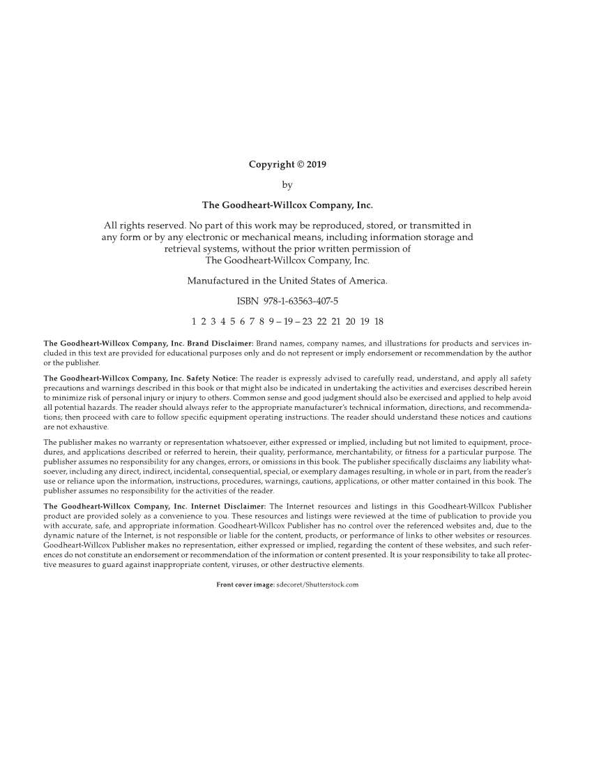 Copyright © 2019 by The Goodheart-Willcox Company, Inc. All rights reserved. No part of this work may be reproduced, stored, or transmitted in any form or by any electronic or mechanical means, including information storage and retrieval systems, without the prior written permission of The Goodheart-Willcox Company, Inc. Manufactured in the United States of America. ISBN 978-1-63563-407-5 1 2 3 4 5 6 7 8 9 – 19 – 23 22 21 20 19 18 The Goodheart-Willcox Company, Inc. Brand Disclaimer: Brand names, company names, and illustrations for products and services in- cluded in this text are provided for educational purposes only and do not represent or imply endorsement or recommendation by the author or the publisher. The Goodheart-Willcox Company, Inc. Safety Notice: The reader is expressly advised to carefully read, understand, and apply all safety precautions and warnings described in this book or that might also be indicated in undertaking the activities and exercises described herein to minimize risk of personal injury or injury to others. Common sense and good judgment should also be exercised and applied to help avoid all potential hazards. The reader should always refer to the appropriate manufacturer’s technical information, directions, and recommenda- tions then proceed with care to follow specifi c equipment operating instructions. The reader should understand these notices and cautions are not exhaustive. The publisher makes no warranty or representation whatsoever, either expressed or implied, including but not limited to equipment, proce- dures, and applications described or referred to herein, their quality, performance, merchantability, or fi tness for a particular purpose. The publisher assumes no responsibility for any changes, errors, or omissions in this book. The publisher specifi cally disclaims any liability what- soever, including any direct, indirect, incidental, consequential, special, or exemplary damages resulting, in whole or in part, from the reader’s use or reliance upon the information, instructions, procedures, warnings, cautions, applications, or other matter contained in this book. The publisher assumes no responsibility for the activities of the reader. The Goodheart-Willcox Company, Inc. Internet Disclaimer: The Internet resources and listings in this Goodheart-Willcox Publisher product are provided solely as a convenience to you. These resources and listings were reviewed at the time of publication to provide you with accurate, safe, and appropriate information. Goodheart-Willcox Publisher has no control over the referenced websites and, due to the dynamic nature of the Internet, is not responsible or liable for the content, products, or performance of links to other websites or resources. Goodheart-Willcox Publisher makes no representation, either expressed or implied, regarding the content of these websites, and such refer- ences do not constitute an endorsement or recommendation of the information or content presented. It is your responsibility to take all protec- tive measures to guard against inappropriate content, viruses, or other destructive elements. Front cover image: sdecoret/Shutterstock.com