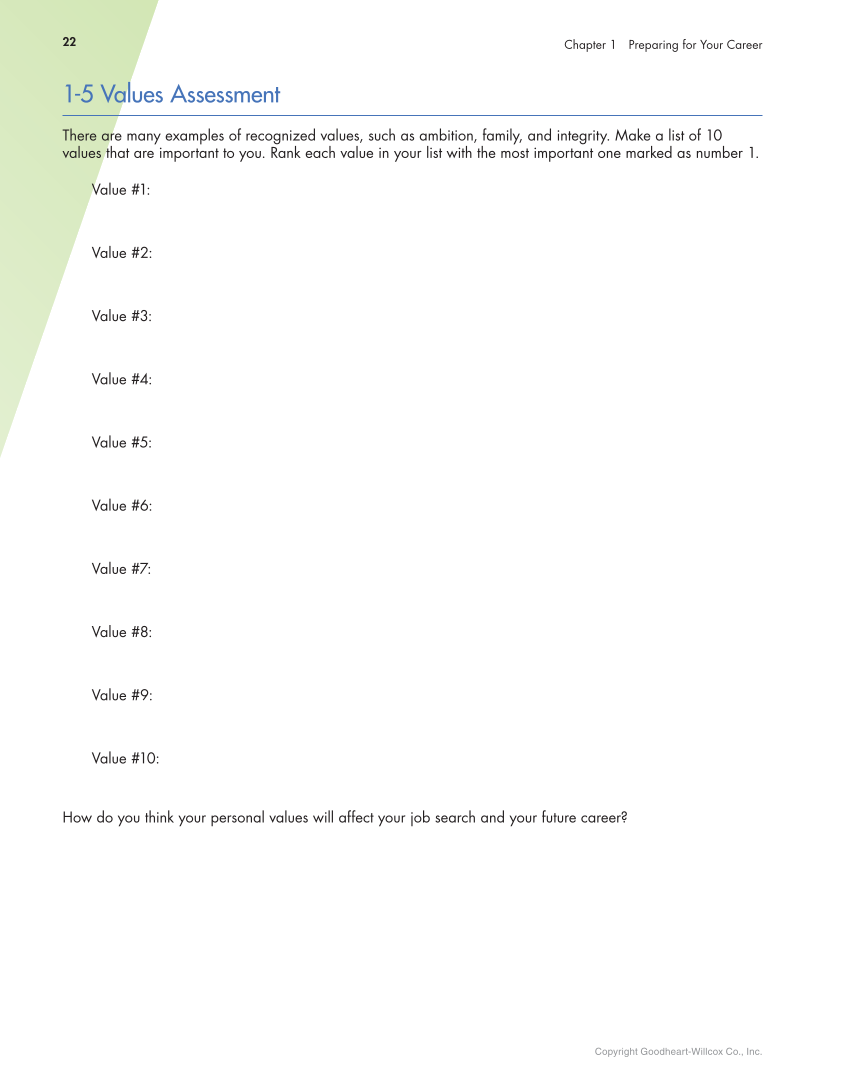 1-5 Values Assessment There are many examples of recognized values, such as ambition, family, and integrity. Make a list of 10 values that are important to you. Rank each value in your list with the most important one marked as number 1. Value #1: Value #2: Value #3: Value #4: Value #5: Value #6: Value #7: Value #8: Value #9: Value #10: How do you think your personal values will affect your job search and your future career? Copyright Goodheart-Willcox Co., Inc. 22 Chapter 1 Preparing for Your Career