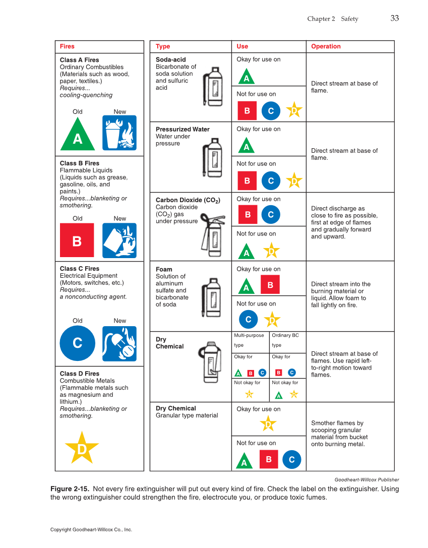 Chapter 2 Safety 33 Fires Type Use Class A Fires Ordinary Combustibles (Materials such as wood, paper, textiles.) Requires... cooling-quenching Class B Fires Flammable Liquids (Liquids such as grease, gasoline, oils, and paints.) Requires...blanketing or smothering. Class C Fires Electrical Equipment (Motors, switches, etc.) Requires... a nonconducting agent. Class D Fires Combustible Metals (Flammable metals such as magnesium and lithium.) Requires...blanketing or smothering. Soda-acid Bicarbonate of soda solution and sulfuric acid Pressurized Water Water under pressure Carbon Dioxide (CO2) Carbon dioxide (CO2) gas under pressure Foam Solution of aluminum sulfate and bicarbonate of soda Dry Chemical Dry Chemical Granular type material Not for use on Okay for use on Not okay for Not okay for Okay for Okay for Multi-purpose type Ordinary BC type Not for use on Not for use on Not for use on Not for use on Okay for use on Okay for use on Okay for use on Okay for use on Operation Direct stream at base of flame. Direct stream at base of flame. Direct discharge as close to fire as possible, first at edge of flames and gradually forward and upward. Direct stream into the burning material or liquid. Allow foam to fall lightly on fire. Direct stream at base of flames. Use rapid left- to-right motion toward flames. Smother flames by scooping granular material from bucket onto burning metal. A B C D A A A A A B C D B B B B C C C C D D D D A D B C A D B C Old New Old New Old New Goodheart-Willcox Publisher Figure 2-15. Not every fire extinguisher will put out every kind of fire. Check the label on the extinguisher. Using the wrong extinguisher could strengthen the fire, electrocute you, or produce toxic fumes. Copyright Goodheart-Willcox Co., Inc.