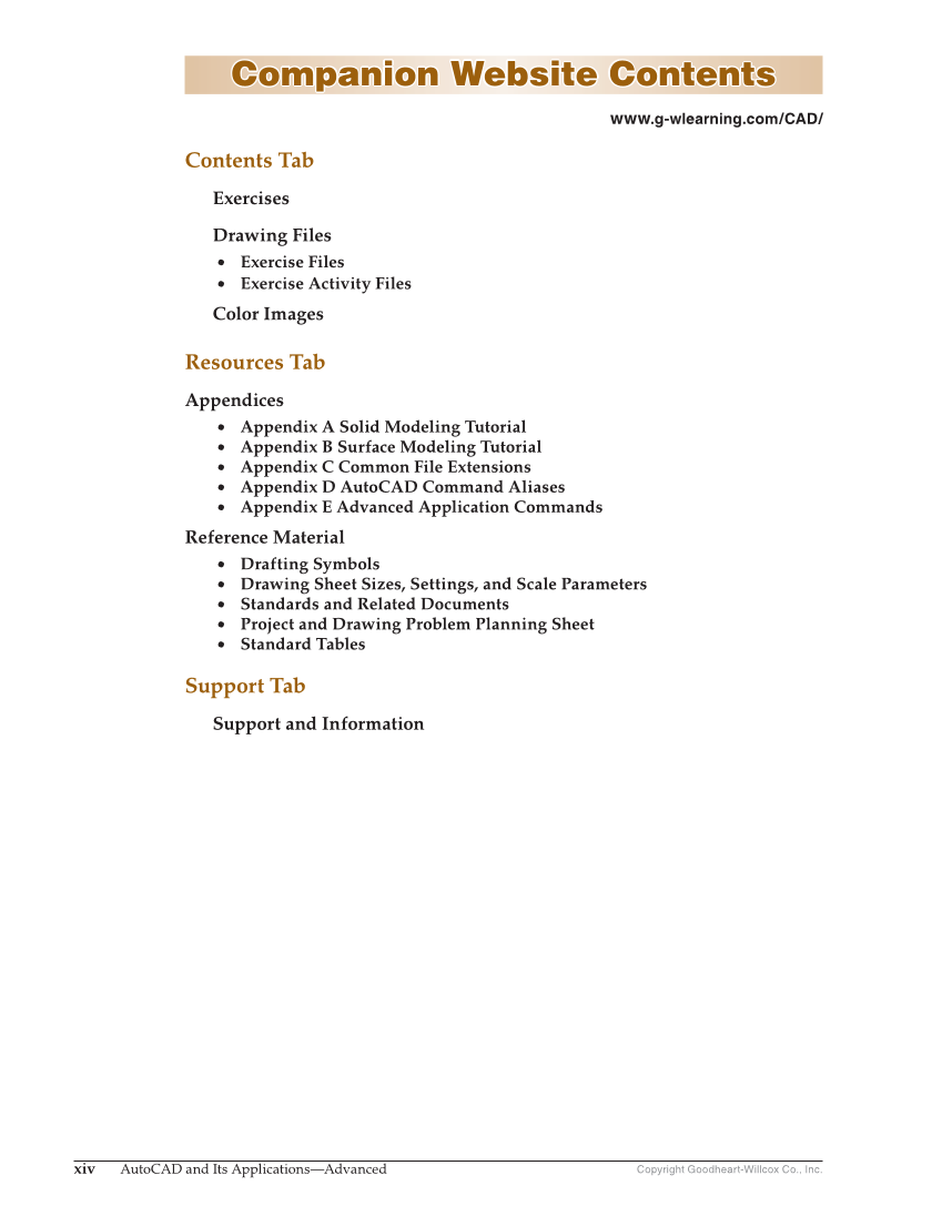 xiv AutoCAD and Its Applications—Advanced Copyright Goodheart-Willcox Co., Inc. Companion Website Contents Companion Website Contents www.g-wlearning.com/CAD/ Contents Tab Exercises Drawing Files • Exercise Files • Exercise Activity Files Color Images Resources Tab Appendices • Appendix A Solid Modeling Tutorial • Appendix B Surface Modeling Tutorial • Appendix C Common File Extensions • Appendix D AutoCAD Command Aliases • Appendix E Advanced Application Commands Reference Material • Drafting Symbols • Drawing Sheet Sizes, Settings, and Scale Parameters • Standards and Related Documents • Project and Drawing Problem Planning Sheet • Standard Tables Support Tab Support and Information