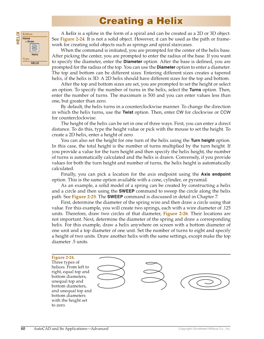 40 AutoCAD and Its Applications—Advanced Copyright Goodheart-Willcox Co., Inc. Creating a Helix Creating a Helix A helix is a spline in the form of a spiral and can be created as a 2D or 3D object. See Figure 2-24. It is not a solid object. However, it can be used as the path or frame- work for creating solid objects such as springs and spiral staircases. When the command is initiated, you are prompted for the center of the helix base. After picking the center, you are prompted to enter the radius of the base. If you want to specify the diameter, enter the Diameter option. After the base is defi ned, you are prompted for the radius of the top. You can use the Diameter option to enter a diameter. The top and bottom can be different sizes. Entering different sizes creates a tapered helix, if the helix is 3D. A 2D helix should have different sizes for the top and bottom. After the top and bottom sizes are set, you are prompted to set the height or select an option. To specify the number of turns in the helix, select the Turns option. Then, enter the number of turns. The maximum is 500 and you can enter values less than one, but greater than zero. By default, the helix turns in a counterclockwise manner. To change the direction in which the helix turns, use the Twist option. Then, enter CW for clockwise or CCW for counterclockwise. The height of the helix can be set in one of three ways. First, you can enter a direct distance. To do this, type the height value or pick with the mouse to set the height. To create a 2D helix, enter a height of zero. You can also set the height for one turn of the helix using the Turn height option. In this case, the total height is the number of turns multiplied by the turn height. If you provide a value for the turn height and then specify the helix height, the number of turns is automatically calculated and the helix is drawn. Conversely, if you provide values for both the turn height and number of turns, the helix height is automatically calculated. Finally, you can pick a location for the axis endpoint using the Axis endpoint option. This is the same option available with a cone, cylinder, or pyramid. As an example, a solid model of a spring can be created by constructing a helix and a circle and then using the SWEEP command to sweep the circle along the helix path. See Figure 2-25. The SWEEP command is discussed in detail in Chapter 7. First, determine the diameter of the spring wire and then draw a circle using that value. For this example, you will create two springs, each with a wire diameter of .125 units. Therefore, draw two circles of that diameter, Figure 2-26. Their locations are not important. Next, determine the diameter of the spring and draw a corresponding helix. For this example, draw a helix anywhere on screen with a bottom diameter of one unit and a top diameter of one unit. Set the number of turns to eight and specify a height of two units. Draw another helix with the same settings, except make the top diameter .5 units. HELIX Ribbon Home Draw Helix Type HELIX Figure 2-24. Three types of helices. From left to right, equal top and bottom diameters, unequal top and bottom diameters, and unequal top and bottom diameters with the height set to zero.