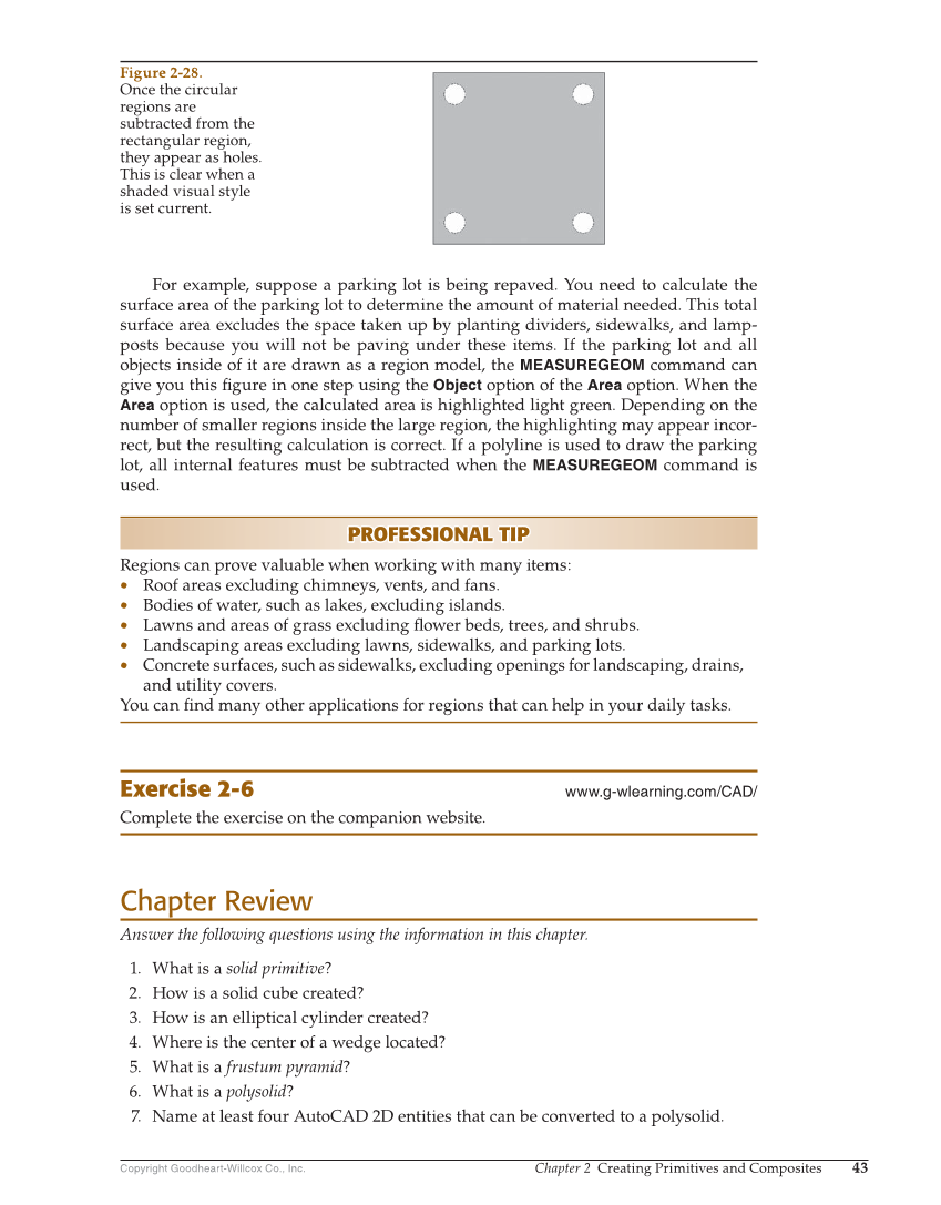 Chapter 2 Creating Primitives and Composites 43 Copyright Goodheart-Willcox Co., Inc. For example, suppose a parking lot is being repaved. You need to calculate the surface area of the parking lot to determine the amount of material needed. This total surface area excludes the space taken up by planting dividers, sidewalks, and lamp- posts because you will not be paving under these items. If the parking lot and all objects inside of it are drawn as a region model, the MEASUREGEOM command can give you this fi gure in one step using the Object option of the Area option. When the Area option is used, the calculated area is highlighted light green. Depending on the number of smaller regions inside the large region, the highlighting may appear incor- rect, but the resulting calculation is correct. If a polyline is used to draw the parking lot, all internal features must be subtracted when the MEASUREGEOM command is used. PROFESSIONAL TIP PROFESSIONAL TIP Regions can prove valuable when working with many items: • Roof areas excluding chimneys, vents, and fans. • Bodies of water, such as lakes, excluding islands. • Lawns and areas of grass excluding fl ower beds, trees, and shrubs. • Landscaping areas excluding lawns, sidewalks, and parking lots. • Concrete surfaces, such as sidewalks, excluding openings for landscaping, drains, and utility covers. You can fi nd many other applications for regions that can help in your daily tasks. Exercise 2-6 www.g-wlearning.com/CAD/ Complete the exercise on the companion website. Chapter Review Answer the following questions using the information in this chapter. 1. What is a solid primitive? 2. How is a solid cube created? 3. How is an elliptical cylinder created? 4. Where is the center of a wedge located? 5. What is a frustum pyramid? 6. What is a polysolid? 7. Name at least four AutoCAD 2D entities that can be converted to a polysolid. Figure 2-28. Once the circular regions are subtracted from the rectangular region, they appear as holes. This is clear when a shaded visual style is set current.