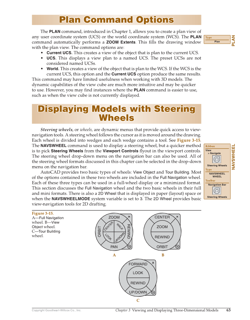 Copyright Goodheart-Willcox Co., Inc. Chapter 3 Viewing and Displaying Three-Dimensional Models 63 Plan Command Options Plan Command Options The PLAN command, introduced in Chapter 1, allows you to create a plan view of any user coordinate system (UCS) or the world coordinate system (WCS). The PLAN command automatically performs a ZOOM Extents. This fi lls the drawing window with the plan view. The command options are: • Current UCS. This creates a view of the object that is plan to the current UCS. • UCS. This displays a view plan to a named UCS. The preset UCSs are not considered named UCSs. • World. This creates a view of the object that is plan to the WCS. If the WCS is the current UCS, this option and the Current UCS option produce the same results. This command may have limited usefulness when working with 3D models. The dynamic capabilities of the view cube are much more intuitive and may be quicker to use. However, you may fi nd instances where the PLAN command is easier to use, such as when the view cube is not currently displayed. Displaying Models with Steering Displaying Models with Steering Wheels Wheels Steering wheels, or wheels, are dynamic menus that provide quick access to view- navigation tools. A steering wheel follows the cursor as it is moved around the drawing. Each wheel is divided into wedges and each wedge contains a tool. See Figure 3-15. The NAVSWHEEL command is used to display a steering wheel, but a quicker method is to pick Steering Wheels from the Viewport Controls fl yout in the viewport controls. The steering wheel drop-down menu on the navigation bar can also be used. All of the steering wheel formats discussed in this chapter can be selected in the drop-down menu on the navigation bar. AutoCAD provides two basic types of wheels: View Object and Tour Building. Most of the options contained in these two wheels are included in the Full Navigation wheel. Each of these three types can be used in a full-wheel display or a minimized format. This section discusses the Full Navigation wheel and the two basic wheels in their full and mini formats. There is also a 2D Wheel that is displayed in paper (layout) space or when the NAVSWHEELMODE system variable is set to 3. The 2D Wheel provides basic view-navigation tools for 2D drafting. PLAN Type Plan NAVSWHEEL Ribbon View Navigate Steering Wheels Type NAVSWHEEL WHEEL Toolbar Navigation Bar Steering Wheels ZOOM PAN ORBIT REWIND CENTER WALK UP/DOWN LOOK CENTER ZOOM ORBIT REWIND FORWARD LOOK UP/DOWN REWIND A B C Figure 3-15. A—Full Navigation wheel. B—View Object wheel. C—Tour Building wheel.