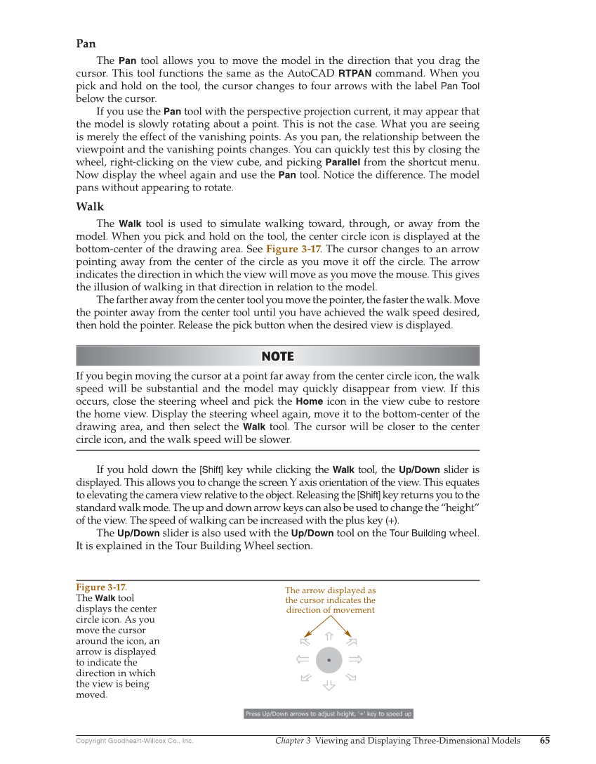 Copyright Goodheart-Willcox Co., Inc. Chapter 3 Viewing and Displaying Three-Dimensional Models 65 Pan The Pan tool allows you to move the model in the direction that you drag the cursor. This tool functions the same as the AutoCAD RTPAN command. When you pick and hold on the tool, the cursor changes to four arrows with the label Pan Tool below the cursor. If you use the Pan tool with the perspective projection current, it may appear that the model is slowly rotating about a point. This is not the case. What you are seeing is merely the effect of the vanishing points. As you pan, the relationship between the viewpoint and the vanishing points changes. You can quickly test this by closing the wheel, right-clicking on the view cube, and picking Parallel from the shortcut menu. Now display the wheel again and use the Pan tool. Notice the difference. The model pans without appearing to rotate. Walk The Walk tool is used to simulate walking toward, through, or away from the model. When you pick and hold on the tool, the center circle icon is displayed at the bottom-center of the drawing area. See Figure 3-17. The cursor changes to an arrow pointing away from the center of the circle as you move it off the circle. The arrow indicates the direction in which the view will move as you move the mouse. This gives the illusion of walking in that direction in relation to the model. The farther away from the center tool you move the pointer, the faster the walk. Move the pointer away from the center tool until you have achieved the walk speed desired, then hold the pointer. Release the pick button when the desired view is displayed. NOTE NOTE If you begin moving the cursor at a point far away from the center circle icon, the walk speed will be substantial and the model may quickly disappear from view. If this occurs, close the steering wheel and pick the Home icon in the view cube to restore the home view. Display the steering wheel again, move it to the bottom-center of the drawing area, and then select the Walk tool. The cursor will be closer to the center circle icon, and the walk speed will be slower. If you hold down the [Shift] key while clicking the Walk tool, the Up/Down slider is displayed. This allows you to change the screen Y axis orientation of the view. This equates to elevating the camera view relative to the object. Releasing the [Shift] key returns you to the standard walk mode. The up and down arrow keys can also be used to change the “height” of the view. The speed of walking can be increased with the plus key (+). The Up/Down slider is also used with the Up/Down tool on the Tour Building wheel. It is explained in the Tour Building Wheel section. The arrow displayed as the cursor indicates the direction of movement Figure 3-17. The Walk tool displays the center circle icon. As you move the cursor around the icon, an arrow is displayed to indicate the direction in which the view is being moved.