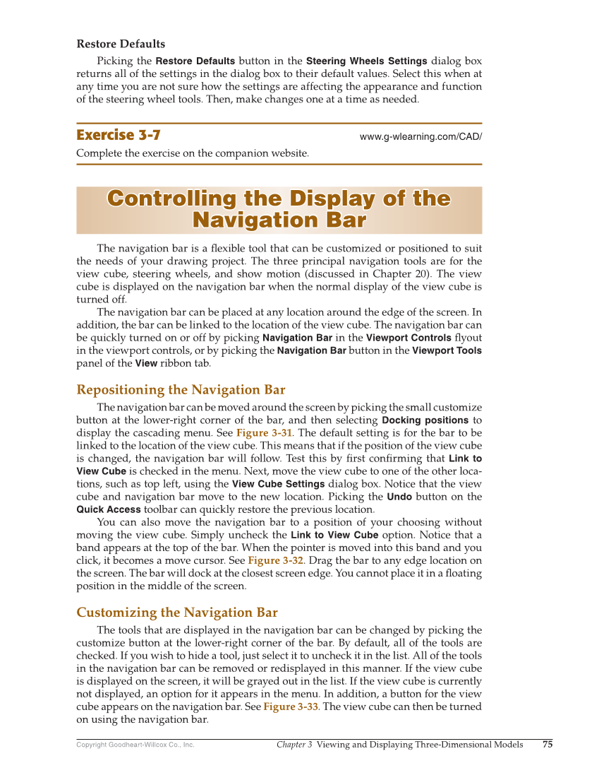 Copyright Goodheart-Willcox Co., Inc. Chapter 3 Viewing and Displaying Three-Dimensional Models 75 Restore Defaults Picking the Restore Defaults button in the Steering Wheels Settings dialog box returns all of the settings in the dialog box to their default values. Select this when at any time you are not sure how the settings are affecting the appearance and function of the steering wheel tools. Then, make changes one at a time as needed. Exercise 3-7 www.g-wlearning.com/CAD/ Complete the exercise on the companion website. Controlling the Display of the Controlling the Display of the Navigation Bar Navigation Bar The navigation bar is a fl exible tool that can be customized or positioned to suit the needs of your drawing project. The three principal navigation tools are for the view cube, steering wheels, and show motion (discussed in Chapter 20). The view cube is displayed on the navigation bar when the normal display of the view cube is turned off. The navigation bar can be placed at any location around the edge of the screen. In addition, the bar can be linked to the location of the view cube. The navigation bar can be quickly turned on or off by picking Navigation Bar in the Viewport Controls fl yout in the viewport controls, or by picking the Navigation Bar button in the Viewport Tools panel of the View ribbon tab. Repositioning the Navigation Bar The navigation bar can be moved around the screen by picking the small customize button at the lower-right corner of the bar, and then selecting Docking positions to display the cascading menu. See Figure 3-31. The default setting is for the bar to be linked to the location of the view cube. This means that if the position of the view cube is changed, the navigation bar will follow. Test this by fi rst confi rming that Link to View Cube is checked in the menu. Next, move the view cube to one of the other loca- tions, such as top left, using the View Cube Settings dialog box. Notice that the view cube and navigation bar move to the new location. Picking the Undo button on the Quick Access toolbar can quickly restore the previous location. You can also move the navigation bar to a position of your choosing without moving the view cube. Simply uncheck the Link to View Cube option. Notice that a band appears at the top of the bar. When the pointer is moved into this band and you click, it becomes a move cursor. See Figure 3-32. Drag the bar to any edge location on the screen. The bar will dock at the closest screen edge. You cannot place it in a fl oating position in the middle of the screen. Customizing the Navigation Bar The tools that are displayed in the navigation bar can be changed by picking the customize button at the lower-right corner of the bar. By default, all of the tools are checked. If you wish to hide a tool, just select it to uncheck it in the list. All of the tools in the navigation bar can be removed or redisplayed in this manner. If the view cube is displayed on the screen, it will be grayed out in the list. If the view cube is currently not displayed, an option for it appears in the menu. In addition, a button for the view cube appears on the navigation bar. See Figure 3-33. The view cube can then be turned on using the navigation bar.