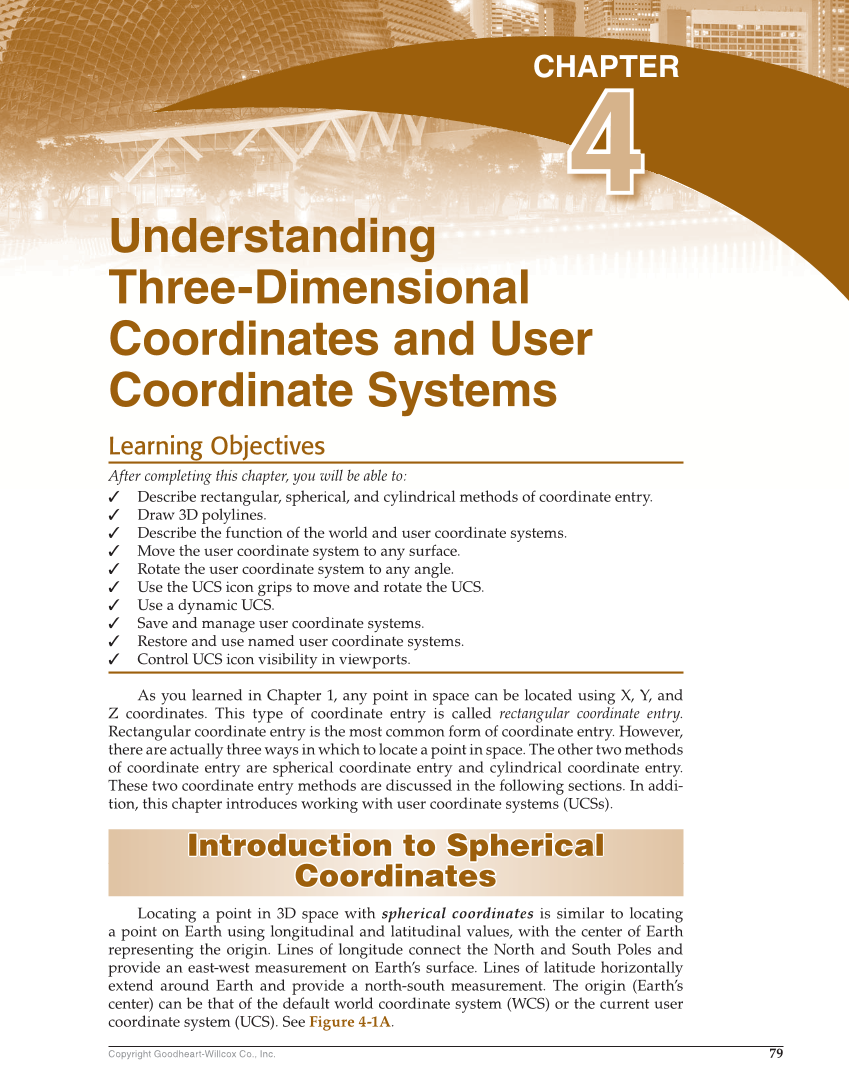 79 Copyright Goodheart-Willcox Co., Inc. Learning Objectives After completing this chapter, you will be able to: ✓ Describe rectangular, spherical, and cylindrical methods of coordinate entry. ✓ Draw 3D polylines. ✓ Describe the function of the world and user coordinate systems. ✓ Move the user coordinate system to any surface. ✓ Rotate the user coordinate system to any angle. ✓ Use the UCS icon grips to move and rotate the UCS. ✓ Use a dynamic UCS. ✓ Save and manage user coordinate systems. ✓ Restore and use named user coordinate systems. ✓ Control UCS icon visibility in viewports. As you learned in Chapter 1, any point in space can be located using X, Y, and Z coordinates. This type of coordinate entry is called rectangular coordinate entry. Rectangular coordinate entry is the most common form of coordinate entry. However, there are actually three ways in which to locate a point in space. The other two methods of coordinate entry are spherical coordinate entry and cylindrical coordinate entry. These two coordinate entry methods are discussed in the following sections. In addi- tion, this chapter introduces working with user coordinate systems (UCSs). Introduction to Spherical Introduction to Spherical Coordinates Coordinates Locating a point in 3D space with spherical coordinates is similar to locating a point on Earth using longitudinal and latitudinal values, with the center of Earth representing the origin. Lines of longitude connect the North and South Poles and provide an east-west measurement on Earth’s surface. Lines of latitude horizontally extend around Earth and provide a north-south measurement. The origin (Earth’s center) can be that of the default world coordinate system (WCS) or the current user coordinate system (UCS). See Figure 4-1A. Understanding Three-Dimensional Coordinates and User Coordinate Systems CHAPTER 4 4