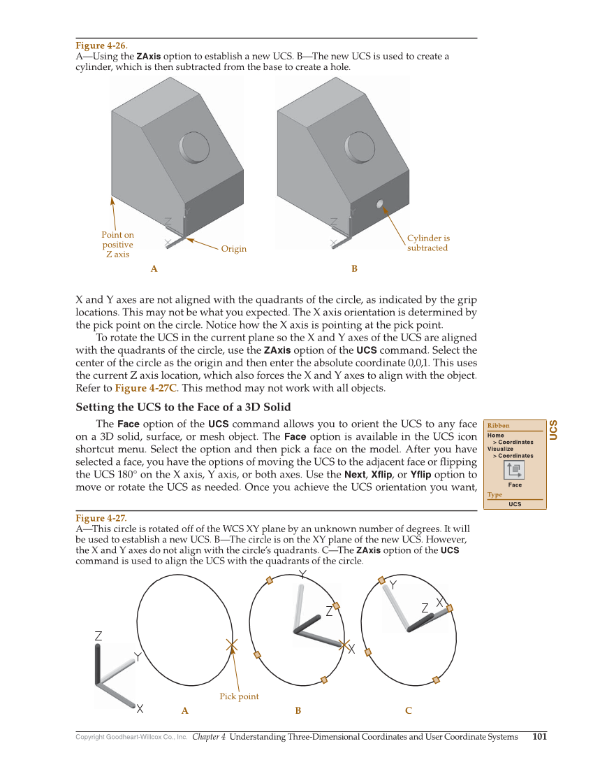 Copyright Goodheart-Willcox Co., Inc. Chapter 4 Understanding Three-Dimensional Coordinates and User Coordinate Systems 101 X and Y axes are not aligned with the quadrants of the circle, as indicated by the grip locations. This may not be what you expected. The X axis orientation is determined by the pick point on the circle. Notice how the X axis is pointing at the pick point. To rotate the UCS in the current plane so the X and Y axes of the UCS are aligned with the quadrants of the circle, use the ZAxis option of the UCS command. Select the center of the circle as the origin and then enter the absolute coordinate 0,0,1. This uses the current Z axis location, which also forces the X and Y axes to align with the object. Refer to Figure 4-27C. This method may not work with all objects. Setting the UCS to the Face of a 3D Solid The Face option of the UCS command allows you to orient the UCS to any face on a 3D solid, surface, or mesh object. The Face option is available in the UCS icon shortcut menu. Select the option and then pick a face on the model. After you have selected a face, you have the options of moving the UCS to the adjacent face or fl ipping the UCS 180° on the X axis, Y axis, or both axes. Use the Next, Xflip, or Yflip option to move or rotate the UCS as needed. Once you achieve the UCS orientation you want, UCS Ribbon Home Coordinates Visualize Coordinates Face Type UCS B A Point on positive Z axis Origin Cylinder is subtracted Figure 4-26. A—Using the ZAxis option to establish a new UCS. B—The new UCS is used to create a cylinder, which is then subtracted from the base to create a hole. Pick point A B C Figure 4-27. A—This circle is rotated off of the WCS XY plane by an unknown number of degrees. It will be used to establish a new UCS. B—The circle is on the XY plane of the new UCS. However, the X and Y axes do not align with the circle’s quadrants. C—The ZAxis option of the UCS command is used to align the UCS with the quadrants of the circle.