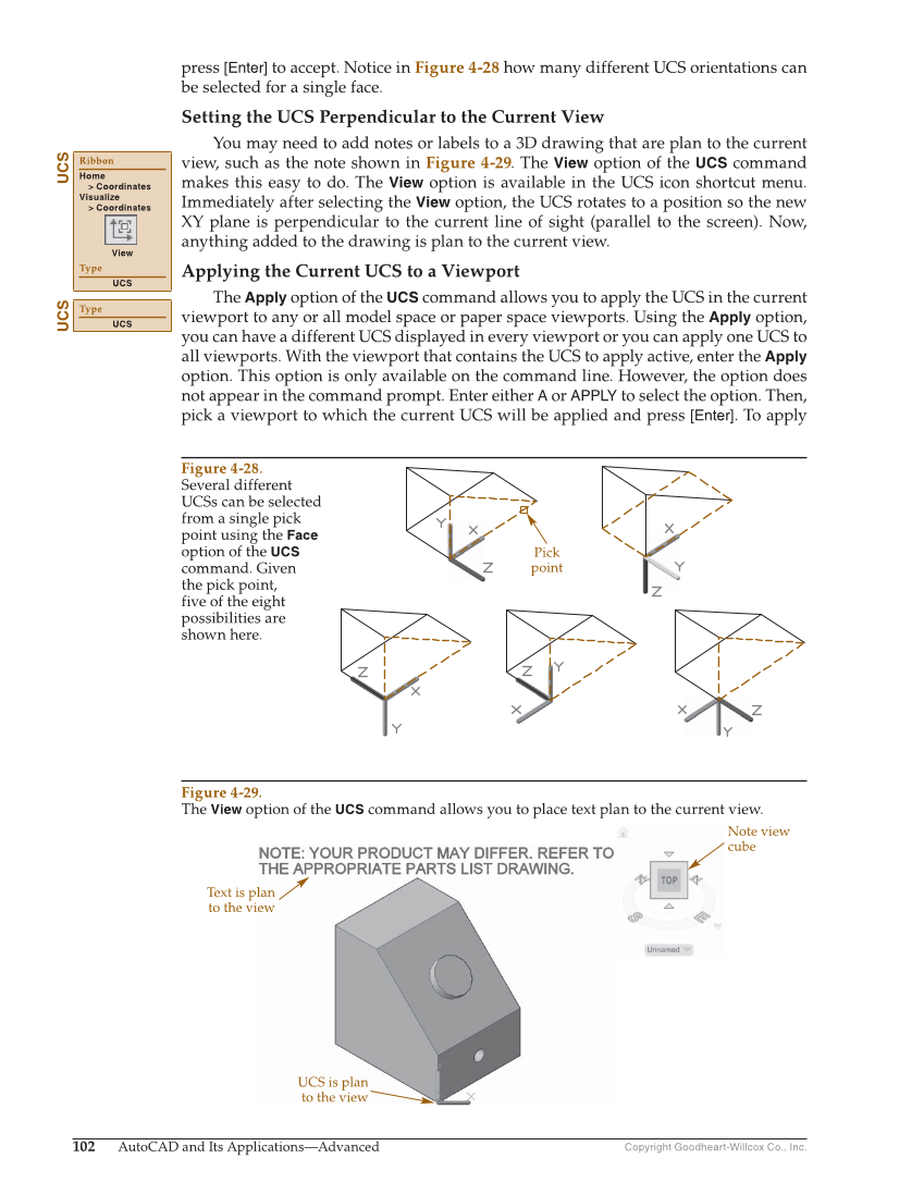 Copyright Goodheart-Willcox Co., Inc. 102 AutoCAD and Its Applications—Advanced press [Enter] to accept. Notice in Figure 4-28 how many different UCS orientations can be selected for a single face. Setting the UCS Perpendicular to the Current View You may need to add notes or labels to a 3D drawing that are plan to the current view, such as the note shown in Figure 4-29. The View option of the UCS command makes this easy to do. The View option is available in the UCS icon shortcut menu. Immediately after selecting the View option, the UCS rotates to a position so the new XY plane is perpendicular to the current line of sight (parallel to the screen). Now, anything added to the drawing is plan to the current view. Applying the Current UCS to a Viewport The Apply option of the UCS command allows you to apply the UCS in the current viewport to any or all model space or paper space viewports. Using the Apply option, you can have a different UCS displayed in every viewport or you can apply one UCS to all viewports. With the viewport that contains the UCS to apply active, enter the Apply option. This option is only available on the command line. However, the option does not appear in the command prompt. Enter either A or APPLY to select the option. Then, pick a viewport to which the current UCS will be applied and press [Enter]. To apply UCS Ribbon Home Coordinates Visualize Coordinates View Type UCS UCS Type UCS Note view cube UCS is plan to the view Text is plan to the view Pick point Figure 4-28. Several different UCSs can be selected from a single pick point using the Face option of the UCS command. Given the pick point, five of the eight possibilities are shown here. Figure 4-29. The View option of the UCS command allows you to place text plan to the current view.