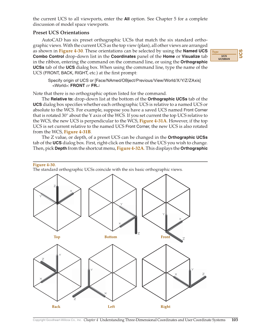 Copyright Goodheart-Willcox Co., Inc. Chapter 4 Understanding Three-Dimensional Coordinates and User Coordinate Systems 103 the current UCS to all viewports, enter the All option. See Chapter 5 for a complete discussion of model space viewports. Preset UCS Orientations AutoCAD has six preset orthographic UCSs that match the six standard ortho- graphic views. With the current UCS as the top view (plan), all other views are arranged as shown in Figure 4-30. These orientations can be selected by using the Named UCS Combo Control drop-down list in the Coordinates panel of the Home or Visualize tab in the ribbon, entering the command on the command line, or using the Orthographic UCSs tab of the UCS dialog box. When using the command line, type the name of the UCS (FRONT, BACK, RIGHT, etc.) at the fi rst prompt: Specify origin of UCS or [Face/NAmed/OBject/Previous/View/World/X/Y/Z/ZAxis] World: FRONT or FR↵ Note that there is no orthographic option listed for the command. The Relative to: drop-down list at the bottom of the Orthographic UCSs tab of the UCS dialog box specifi es whether each orthographic UCS is relative to a named UCS or absolute to the WCS. For example, suppose you have a saved UCS named Front Corner that is rotated 30° about the Y axis of the WCS. If you set current the top UCS relative to the WCS, the new UCS is perpendicular to the WCS, Figure 4-31A. However, if the top UCS is set current relative to the named UCS Front Corner, the new UCS is also rotated from the WCS, Figure 4-31B. The Z value, or depth, of a preset UCS can be changed in the Orthographic UCSs tab of the UCS dialog box. First, right-click on the name of the UCS you wish to change. Then, pick Depth from the shortcut menu, Figure 4-32A. This displays the Orthographic UCS Type UCS UCSMAN Top Bottom Front Back Left Right Figure 4-30. The standard orthographic UCSs coincide with the six basic orthographic views.