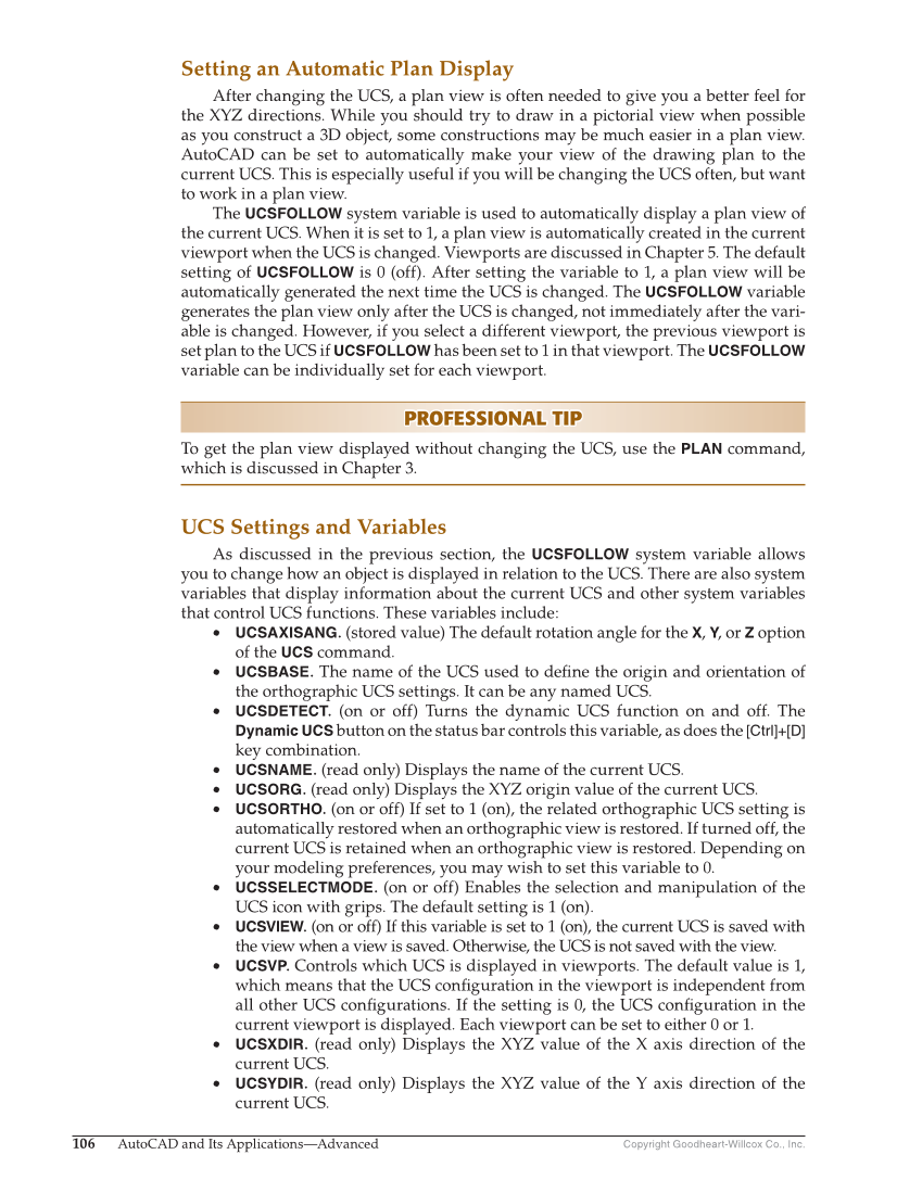 Copyright Goodheart-Willcox Co., Inc. 106 AutoCAD and Its Applications—Advanced Setting an Automatic Plan Display After changing the UCS, a plan view is often needed to give you a better feel for the XYZ directions. While you should try to draw in a pictorial view when possible as you construct a 3D object, some constructions may be much easier in a plan view. AutoCAD can be set to automatically make your view of the drawing plan to the current UCS. This is especially useful if you will be changing the UCS often, but want to work in a plan view. The UCSFOLLOW system variable is used to automatically display a plan view of the current UCS. When it is set to 1, a plan view is automatically created in the current viewport when the UCS is changed. Viewports are discussed in Chapter 5. The default setting of UCSFOLLOW is 0 (off). After setting the variable to 1, a plan view will be automatically generated the next time the UCS is changed. The UCSFOLLOW variable generates the plan view only after the UCS is changed, not immediately after the vari- able is changed. However, if you select a different viewport, the previous viewport is set plan to the UCS if UCSFOLLOW has been set to 1 in that viewport. The UCSFOLLOW variable can be individually set for each viewport. PROFESSIONAL TIP PROFESSIONAL TIP To get the plan view displayed without changing the UCS, use the PLAN command, which is discussed in Chapter 3. UCS Settings and Variables As discussed in the previous section, the UCSFOLLOW system variable allows you to change how an object is displayed in relation to the UCS. There are also system variables that display information about the current UCS and other system variables that control UCS functions. These variables include: • UCSAXISANG. (stored value) The default rotation angle for the X, Y, or Z option of the UCS command. • UCSBASE. The name of the UCS used to defi ne the origin and orientation of the orthographic UCS settings. It can be any named UCS. • UCSDETECT. (on or off) Turns the dynamic UCS function on and off. The Dynamic UCS button on the status bar controls this variable, as does the [Ctrl]+[D] key combination. • UCSNAME. (read only) Displays the name of the current UCS. • UCSORG. (read only) Displays the XYZ origin value of the current UCS. • UCSORTHO. (on or off) If set to 1 (on), the related orthographic UCS setting is automatically restored when an orthographic view is restored. If turned off, the current UCS is retained when an orthographic view is restored. Depending on your modeling preferences, you may wish to set this variable to 0. • UCSSELECTMODE. (on or off) Enables the selection and manipulation of the UCS icon with grips. The default setting is 1 (on). • UCSVIEW. (on or off) If this variable is set to 1 (on), the current UCS is saved with the view when a view is saved. Otherwise, the UCS is not saved with the view. • UCSVP. Controls which UCS is displayed in viewports. The default value is 1, which means that the UCS confi guration in the viewport is independent from all other UCS confi gurations. If the setting is 0, the UCS confi guration in the current viewport is displayed. Each viewport can be set to either 0 or 1. • UCSXDIR. (read only) Displays the XYZ value of the X axis direction of the current UCS. • UCSYDIR. (read only) Displays the XYZ value of the Y axis direction of the current UCS.