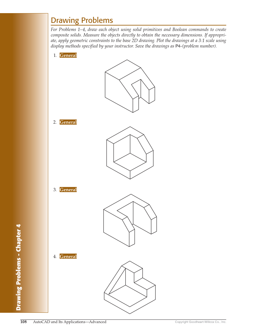Drawing Problems - Chapter 4 Copyright Goodheart-Willcox Co., Inc. 108 AutoCAD and Its Applications—Advanced Drawing Problems For Problems 1–4, draw each object using solid primitives and Boolean commands to create composite solids. Measure the objects directly to obtain the necessary dimensions. If appropri- ate, apply geometric constraints to the base 2D drawing. Plot the drawings at a 3:1 scale using display methods specified by your instructor. Save the drawings as P4-(problem number). 1. General 2. General 3. General 4. General