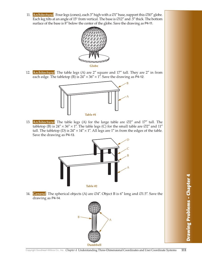 Drawing Problems - Chapter 4 Copyright Goodheart-Willcox Co., Inc. Chapter 4 Understanding Three-Dimensional Coordinates and User Coordinate Systems 111 12. Architectural The table legs (A) are 2″ square and 17″ tall. They are 2″ in from each edge. The tabletop (B) is 24″ × 36″ × 1″. Save the drawing as P4-12. 11. Architectural Four legs (cones), each 3″ high with a ∅1″ base, support this ∅10″ globe. Each leg tilts at an angle of 15° from vertical. The base is ∅12″ and .5″ thick. The bottom surface of the base is 8″ below the center of the globe. Save the drawing as P4-11. 13. Architectural The table legs (A) for the large table are ∅2″ and 17″ tall. The tabletop (B) is 24″ × 36″ × 1″. The table legs (C) for the small table are ∅2″ and 11″ tall. The tabletop (D) is 24″ × 14″ × 1″. All legs are 1″ in from the edges of the table. Save the drawing as P4-13. 14. General The spherical objects (A) are ∅4″. Object B is 6″ long and ∅1.5″. Save the drawing as P4-14. Globe A B Table #1 Table #2 D C B A B A Dumbbell