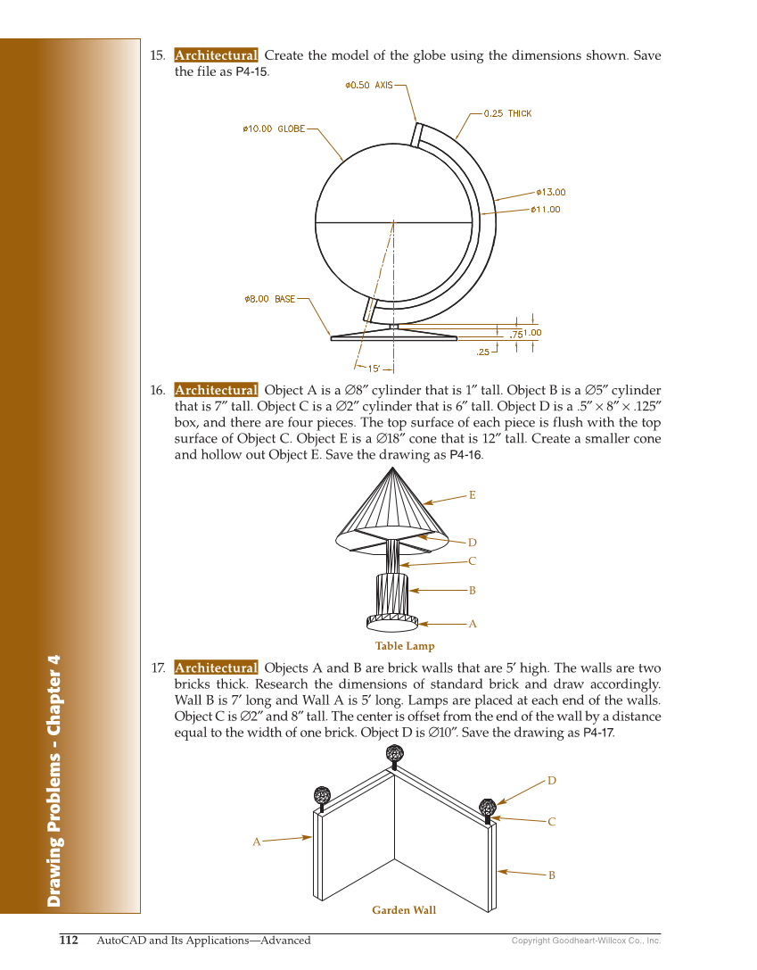 Drawing Problems - Chapter 4 Copyright Goodheart-Willcox Co., Inc. 112 AutoCAD and Its Applications—Advanced 15. Architectural Create the model of the globe using the dimensions shown. Save the file as P4-15. A B C D E Table Lamp A B C D Garden Wall 16. Architectural Object A is a ∅8″ cylinder that is 1″ tall. Object B is a ∅5″ cylinder that is 7″ tall. Object C is a ∅2″ cylinder that is 6″ tall. Object D is a .5″ × 8″ × .125″ box, and there are four pieces. The top surface of each piece is flush with the top surface of Object C. Object E is a ∅18″ cone that is 12″ tall. Create a smaller cone and hollow out Object E. Save the drawing as P4-16. 17. Architectural Objects A and B are brick walls that are 5′ high. The walls are two bricks thick. Research the dimensions of standard brick and draw accordingly. Wall B is 7′ long and Wall A is 5′ long. Lamps are placed at each end of the walls. Object C is ∅2″ and 8″ tall. The center is offset from the end of the wall by a distance equal to the width of one brick. Object D is ∅10″. Save the drawing as P4-17.