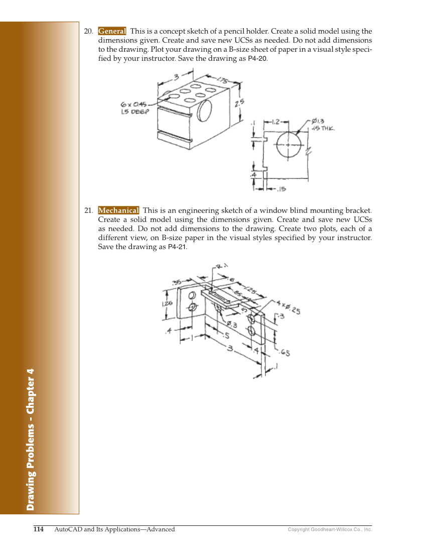 Drawing Problems - Chapter 4 Copyright Goodheart-Willcox Co., Inc. 114 AutoCAD and Its Applications—Advanced 20. General This is a concept sketch of a pencil holder. Create a solid model using the dimensions given. Create and save new UCSs as needed. Do not add dimensions to the drawing. Plot your drawing on a B-size sheet of paper in a visual style speci- fied by your instructor. Save the drawing as P4-20. 21. Mechanical This is an engineering sketch of a window blind mounting bracket. Create a solid model using the dimensions given. Create and save new UCSs as needed. Do not add dimensions to the drawing. Create two plots, each of a different view, on B-size paper in the visual styles specified by your instructor. Save the drawing as P4-21.