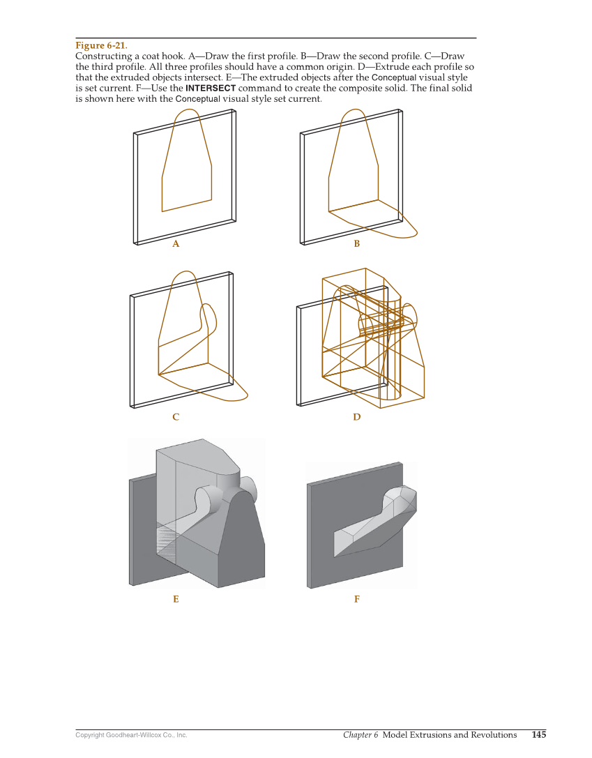 Copyright Goodheart-Willcox Co., Inc. Chapter 6 Model Extrusions and Revolutions 145 A B C D E F Figure 6-21. Constructing a coat hook. A—Draw the first profile. B—Draw the second profile. C—Draw the third profile. All three profiles should have a common origin. D—Extrude each profile so that the extruded objects intersect. E—The extruded objects after the Conceptual visual style is set current. F—Use the INTERSECT command to create the composite solid. The final solid is shown here with the Conceptual visual style set current.
