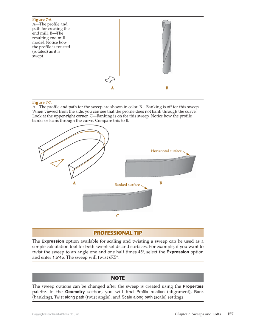 Copyright Goodheart-Willcox Co., Inc. Chapter 7 Sweeps and Lofts 157 PROFESSIONAL TIP PROFESSIONAL TIP The Expression option available for scaling and twisting a sweep can be used as a simple calculation tool for both swept solids and surfaces. For example, if you want to twist the sweep to an angle one and one half times 45°, select the Expression option and enter 1.5*45. The sweep will twist 67.5°. NOTE NOTE The sweep options can be changed after the sweep is created using the Properties palette. In the Geometry section, you will fi nd Profile rotation (alignment), Bank (banking), Twist along path (twist angle), and Scale along path (scale) settings. A B C Horizontal surface Banked surface A B Figure 7-6. A—The profile and path for creating the end mill. B—The resulting end mill model. Notice how the profile is twisted (rotated) as it is swept. Figure 7-7. A—The profile and path for the sweep are shown in color. B—Banking is off for this sweep. When viewed from the side, you can see that the profile does not bank through the curve. Look at the upper-right corner. C—Banking is on for this sweep. Notice how the profile banks or leans through the curve. Compare this to B.
