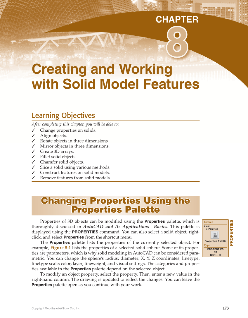 173 Copyright Goodheart-Willcox Co., Inc. Learning Objectives After completing this chapter, you will be able to: ✓ Change properties on solids. ✓ Align objects. ✓ Rotate objects in three dimensions. ✓ Mirror objects in three dimensions. ✓ Create 3D arrays. ✓ Fillet solid objects. ✓ Chamfer solid objects. ✓ Slice a solid using various methods. ✓ Construct features on solid models. ✓ Remove features from solid models. Changing Properties Using the Changing Properties Using the Properties Palette Properties Palette Properties of 3D objects can be modifi ed using the Properties palette, which is thoroughly discussed in AutoCAD and Its Applications—Basics. This palette is displayed using the PROPERTIES command. You can also select a solid object, right- click, and select Properties from the shortcut menu. The Properties palette lists the properties of the currently selected object. For example, Figure 8-1 lists the properties of a selected solid sphere. Some of its proper- ties are parameters, which is why solid modeling in AutoCAD can be considered para- metric. You can change the sphere’s radius diameter X, Y, Z coordinates linetype linetype scale color layer lineweight and visual settings. The categories and proper- ties available in the Properties palette depend on the selected object. To modify an object property, select the property. Then, enter a new value in the right-hand column. The drawing is updated to refl ect the changes. You can leave the Properties palette open as you continue with your work. PROPERTIES Ribbon View Palettes Properties Palette Type PROPERTIES PR [Ctrl]+[1] Creating and Working with Solid Model Features CHAPTER 8 8