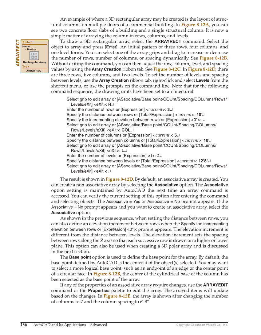 Copyright Goodheart-Willcox Co., Inc. 186 AutoCAD and Its Applications—Advanced An example of where a 3D rectangular array may be created is the layout of struc- tural columns on multiple fl oors of a commercial building. In Figure 8-12A, you can see two concrete fl oor slabs of a building and a single structural column. It is now a simple matter of arraying the column in rows, columns, and levels. To draw a 3D rectangular array, select the ARRAYRECT command. Select the object to array and press [Enter]. An initial pattern of three rows, four columns, and one level forms. You can select one of the array grips and drag to increase or decrease the number of rows, number of columns, or spacing dynamically. See Figure 8-12B. Without exiting the command, you can then adjust the row, column, level, and spacing values by using the Array Creation ribbon tab. See Figure 8-12C. In Figure 8-12D, there are three rows, fi ve columns, and two levels. To set the number of levels and spacing between levels, use the Array Creation ribbon tab, right-click and select Levels from the shortcut menu, or use the prompts on the command line. Note that for the following command sequence, the drawing units have been set to architectural. Select grip to edit array or [ASsociative/Base point/COUnt/Spacing/COLumns/Rows/ Levels/eXit] eXit: R↵ Enter the number of rows or [Expression] current: 3↵ Specify the distance between rows or [Total/Expression] current: 10'↵ Specify the incrementing elevation between rows or [Expression] 0”: ↵ Select grip to edit array or [ASsociative/Base point/COUnt/Spacing/COLumns/ Rows/Levels/eXit] eXit: COL↵ Enter the number of columns or [Expression] current: 5↵ Specify the distance between columns or [Total/Expression] current: 10'↵ Select grip to edit array or [ASsociative/Base point/COUnt/Spacing/COLumns/ Rows/Levels/eXit] eXit: L↵ Enter the number of levels or [Expression] 1: 2↵ Specify the distance between levels or [Total/Expression] current: 12'8"↵ Select grip to edit array or [ASsociative/Base point/COUnt/Spacing/COLumns/Rows/ Levels/eXit] eXit: ↵ The result is shown in Figure 8-12D. By default, an associative array is created. You can create a non-associative array by selecting the Associative option. The Associative option setting is maintained by AutoCAD the next time an array command is accessed. You can verify the current setting of this option after entering the command and selecting objects. The Associative = Yes or Associative = No prompt appears. If the Associative = No prompt appears and you want to create an associative array, select the Associative option. As shown in the previous sequence, when setting the distance between rows, you can also defi ne an elevation increment between rows when the Specify the incrementing elevation between rows or [Expression] 0": prompt appears. The elevation increment is different from the distance between levels. The elevation increment sets the spacing between rows along the Z axis so that each successive row is drawn on a higher or lower plane. This option can also be used when creating a 3D polar array and is discussed in the next section. The Base point option is used to defi ne the base point for the array. By default, the base point defi ned by AutoCAD is the centroid of the object(s) selected. You may want to select a more logical base point, such as an endpoint of an edge or the center point of a circular face. In Figure 8-12B, the center of the cylindrical base of the column has been selected as the base point of the array. If any of the properties of an associative array require changes, use the ARRAYEDIT command or the Properties palette to edit the array. The arrayed items will update based on the changes. In Figure 8-12E, the array is shown after changing the number of columns to 7 and the column spacing to 6′-8″. ARRAYRECT Ribbon Home Modify Rectangular Array Type ARRAYRECT