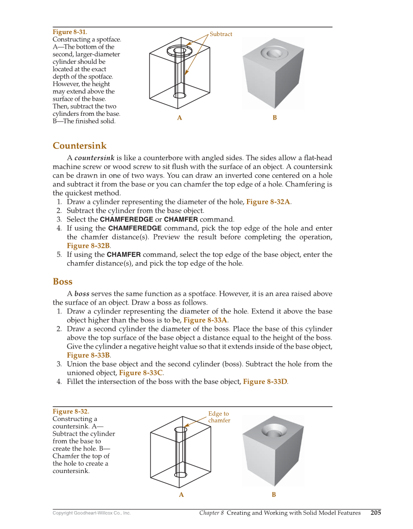 Copyright Goodheart-Willcox Co., Inc. Chapter 8 Creating and Working with Solid Model Features 205 Countersink A countersink is like a counterbore with angled sides. The sides allow a fl at-head machine screw or wood screw to sit fl ush with the surface of an object. A countersink can be drawn in one of two ways. You can draw an inverted cone centered on a hole and subtract it from the base or you can chamfer the top edge of a hole. Chamfering is the quickest method. 1. Draw a cylinder representing the diameter of the hole, Figure 8-32A. 2. Subtract the cylinder from the base object. 3. Select the CHAMFEREDGE or CHAMFER command. 4. If using the CHAMFEREDGE command, pick the top edge of the hole and enter the chamfer distance(s). Preview the result before completing the operation, Figure 8-32B. 5. If using the CHAMFER command, select the top edge of the base object, enter the chamfer distance(s), and pick the top edge of the hole. Boss A boss serves the same function as a spotface. However, it is an area raised above the surface of an object. Draw a boss as follows. 1. Draw a cylinder representing the diameter of the hole. Extend it above the base object higher than the boss is to be, Figure 8-33A. 2. Draw a second cylinder the diameter of the boss. Place the base of this cylinder above the top surface of the base object a distance equal to the height of the boss. Give the cylinder a negative height value so that it extends inside of the base object, Figure 8-33B. 3. Union the base object and the second cylinder (boss). Subtract the hole from the unioned object, Figure 8-33C. 4. Fillet the intersection of the boss with the base object, Figure 8-33D. Subtract A B Figure 8-31. Constructing a spotface. A—The bottom of the second, larger-diameter cylinder should be located at the exact depth of the spotface. However, the height may extend above the surface of the base. Then, subtract the two cylinders from the base. B—The finished solid. Edge to chamfer A B Figure 8-32. Constructing a countersink. A— Subtract the cylinder from the base to create the hole. B— Chamfer the top of the hole to create a countersink.