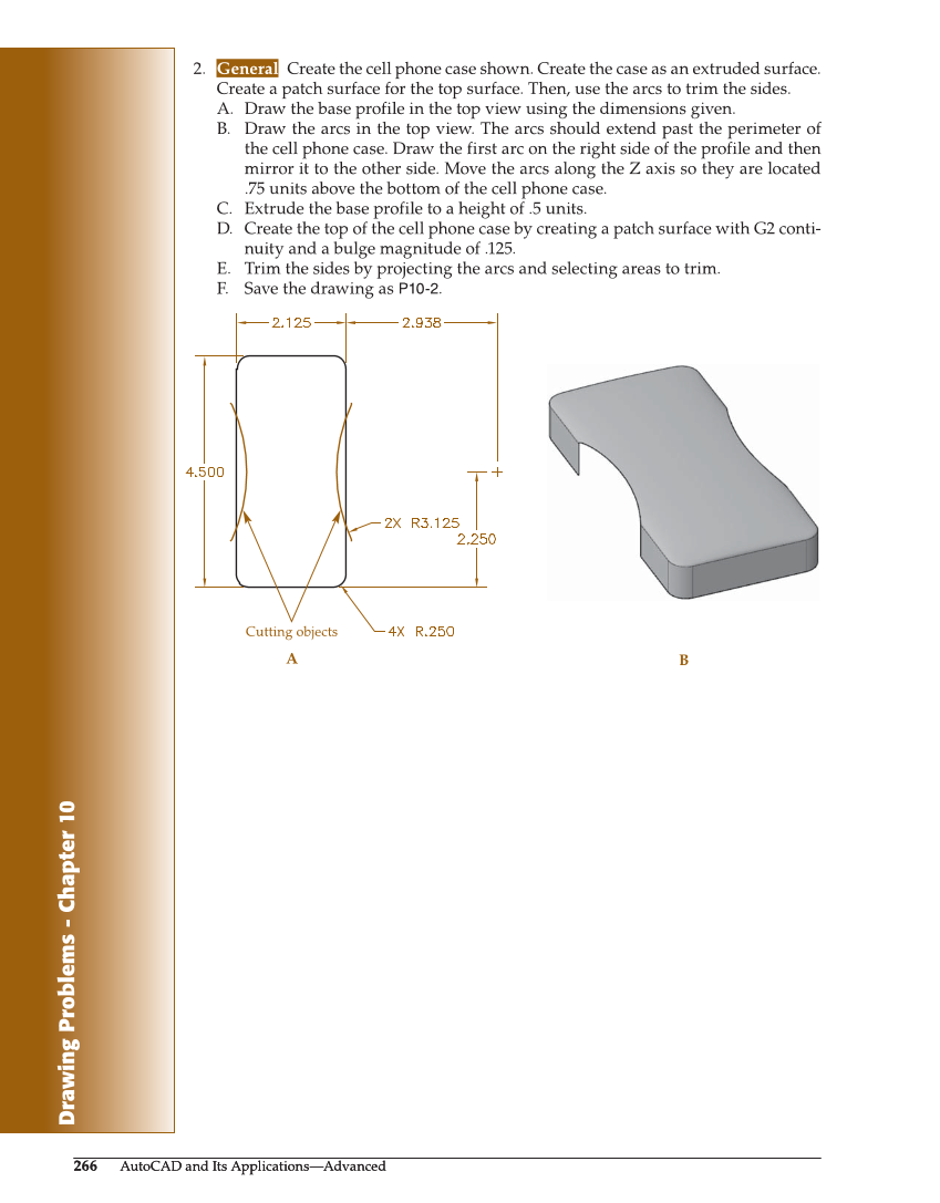 Drawing Problems - Chapter 10 266 AutoCAD and Its Applications—Advanced 266 AutoCAD and Its Applications—Advanced 2. General Create the cell phone case shown. Create the case as an extruded surface. Create a patch surface for the top surface. Then, use the arcs to trim the sides. A. Draw the base profile in the top view using the dimensions given. B. Draw the arcs in the top view. The arcs should extend past the perimeter of the cell phone case. Draw the first arc on the right side of the profile and then mirror it to the other side. Move the arcs along the Z axis so they are located .75 units above the bottom of the cell phone case. C. Extrude the base profile to a height of .5 units. D. Create the top of the cell phone case by creating a patch surface with G2 conti- nuity and a bulge magnitude of .125. E. Trim the sides by projecting the arcs and selecting areas to trim. F. Save the drawing as P10-2. Cutting objects A B