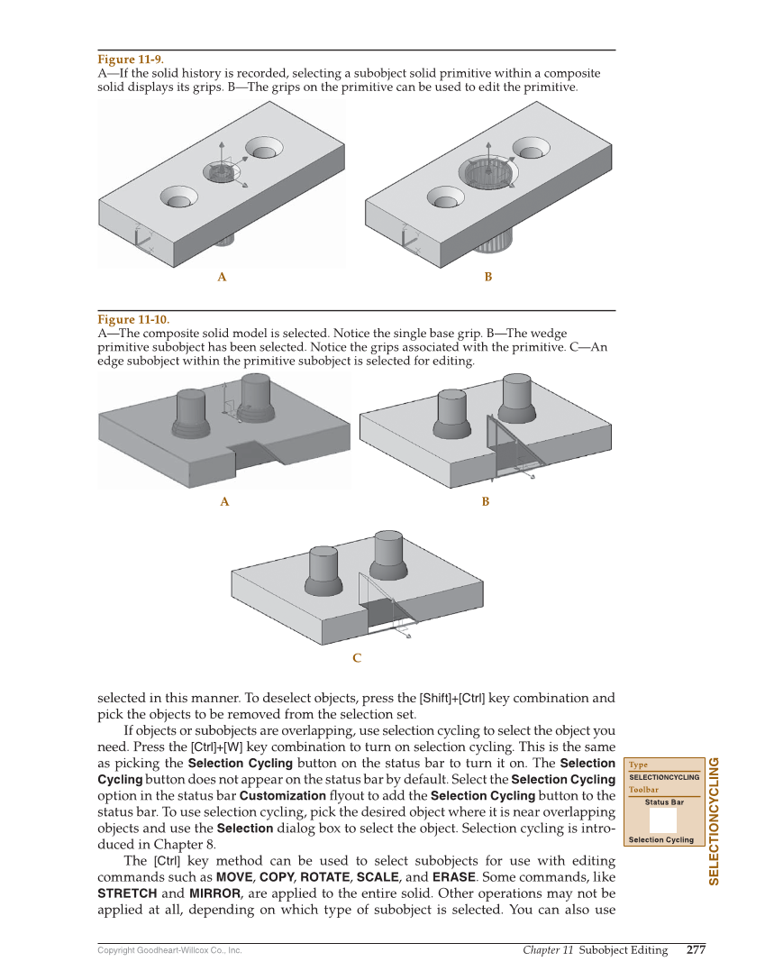 Copyright Goodheart-Willcox Co., Inc. Chapter 11 Subobject Editing 277 selected in this manner. To deselect objects, press the [Shift]+[Ctrl] key combination and pick the objects to be removed from the selection set. If objects or subobjects are overlapping, use selection cycling to select the object you need. Press the [Ctrl]+[W] key combination to turn on selection cycling. This is the same as picking the Selection Cycling button on the status bar to turn it on. The Selection Cycling button does not appear on the status bar by default. Select the Selection Cycling option in the status bar Customization fl yout to add the Selection Cycling button to the status bar. To use selection cycling, pick the desired object where it is near overlapping objects and use the Selection dialog box to select the object. Selection cycling is intro- duced in Chapter 8. The [Ctrl] key method can be used to select subobjects for use with editing commands such as MOVE, COPY, ROTATE, SCALE, and ERASE. Some commands, like STRETCH and MIRROR, are applied to the entire solid. Other operations may not be applied at all, depending on which type of subobject is selected. You can also use A B A B C Figure 11-9. A—If the solid history is recorded, selecting a subobject solid primitive within a composite solid displays its grips. B—The grips on the primitive can be used to edit the primitive. Figure 11-10. A—The composite solid model is selected. Notice the single base grip. B—The wedge primitive subobject has been selected. Notice the grips associated with the primitive. C—An edge subobject within the primitive subobject is selected for editing. SELECTIONCYCLING Type SELECTIONCYCLING Toolbar Status Bar Selection Cycling