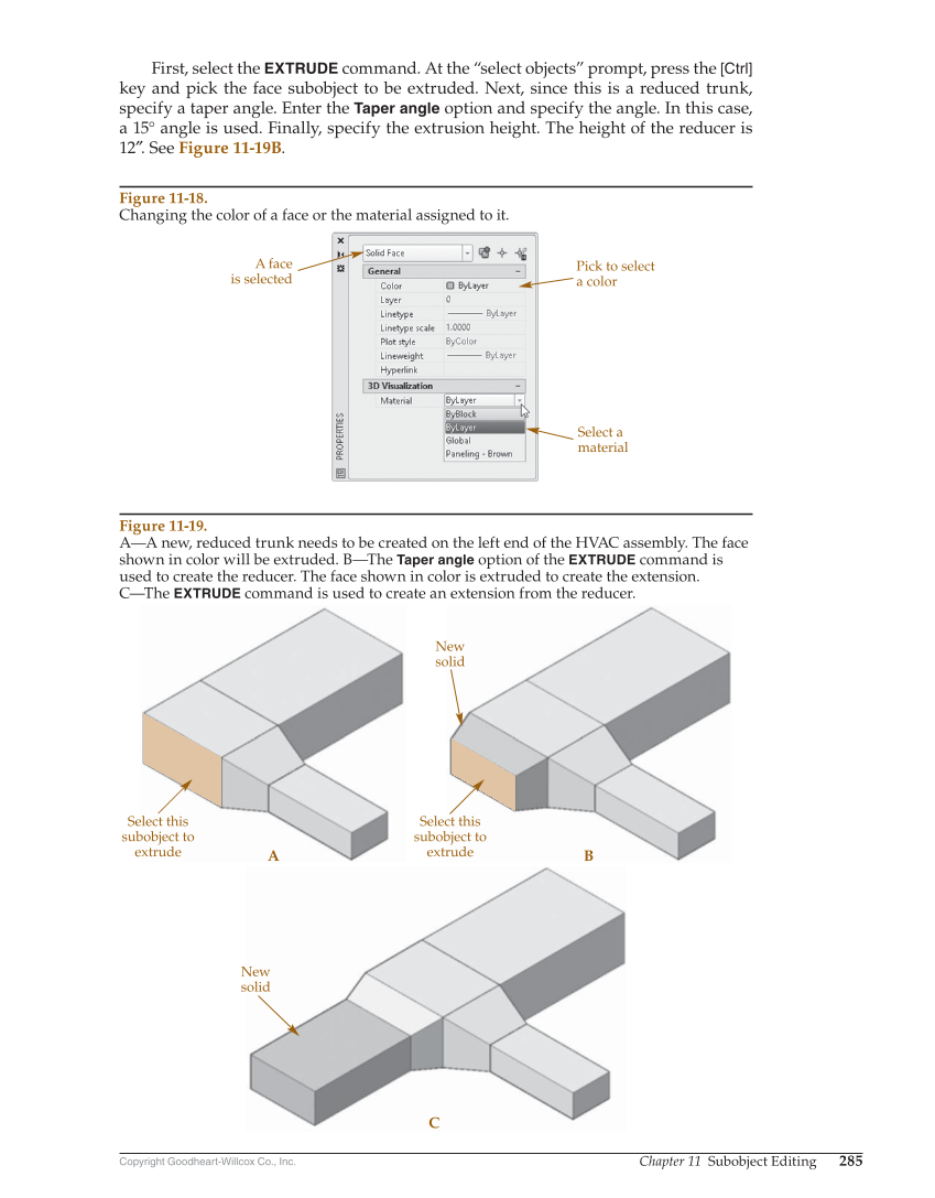 Copyright Goodheart-Willcox Co., Inc. Chapter 11 Subobject Editing 285 First, select the EXTRUDE command. At the “select objects” prompt, press the [Ctrl] key and pick the face subobject to be extruded. Next, since this is a reduced trunk, specify a taper angle. Enter the Taper angle option and specify the angle. In this case, a 15° angle is used. Finally, specify the extrusion height. The height of the reducer is 12″. See Figure 11-19B. A face is selected Pick to select a color Select a material Figure 11-18. Changing the color of a face or the material assigned to it. Select this subobject to extrude C A B Select this subobject to extrude New solid New solid Figure 11-19. A—A new, reduced trunk needs to be created on the left end of the HVAC assembly. The face shown in color will be extruded. B—The Taper angle option of the EXTRUDE command is used to create the reducer. The face shown in color is extruded to create the extension. C—The EXTRUDE command is used to create an extension from the reducer.