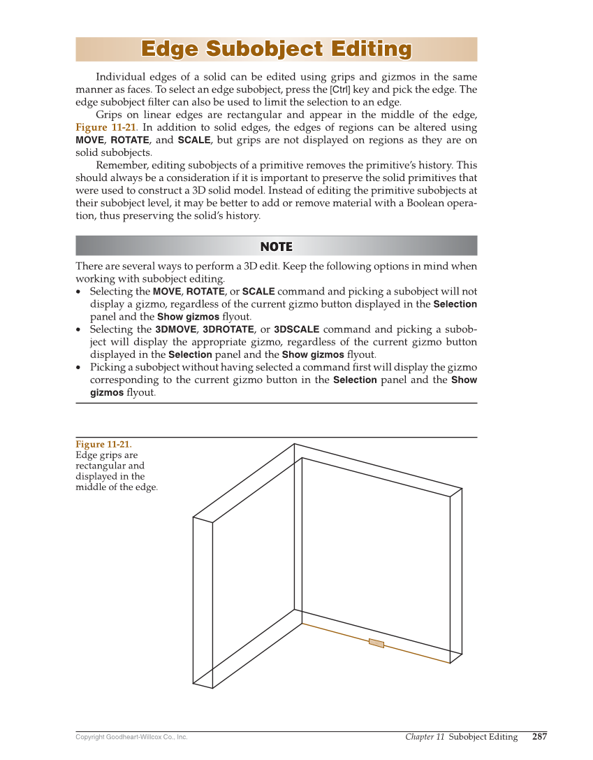 Copyright Goodheart-Willcox Co., Inc. Chapter 11 Subobject Editing 287 Edge Subobject Editing Edge Subobject Editing Individual edges of a solid can be edited using grips and gizmos in the same manner as faces. To select an edge subobject, press the [Ctrl] key and pick the edge. The edge subobject fi lter can also be used to limit the selection to an edge. Grips on linear edges are rectangular and appear in the middle of the edge, Figure 11-21. In addition to solid edges, the edges of regions can be altered using MOVE, ROTATE, and SCALE, but grips are not displayed on regions as they are on solid subobjects. Remember, editing subobjects of a primitive removes the primitive’s history. This should always be a consideration if it is important to preserve the solid primitives that were used to construct a 3D solid model. Instead of editing the primitive subobjects at their subobject level, it may be better to add or remove material with a Boolean opera- tion, thus preserving the solid’s history. NOTE NOTE There are several ways to perform a 3D edit. Keep the following options in mind when working with subobject editing. • Selecting the MOVE, ROTATE, or SCALE command and picking a subobject will not display a gizmo, regardless of the current gizmo button displayed in the Selection panel and the Show gizmos fl yout. • Selecting the 3DMOVE, 3DROTATE, or 3DSCALE command and picking a subob- ject will display the appropriate gizmo, regardless of the current gizmo button displayed in the Selection panel and the Show gizmos fl yout. • Picking a subobject without having selected a command fi rst will display the gizmo corresponding to the current gizmo button in the Selection panel and the Show gizmos fl yout. Figure 11-21. Edge grips are rectangular and displayed in the middle of the edge.