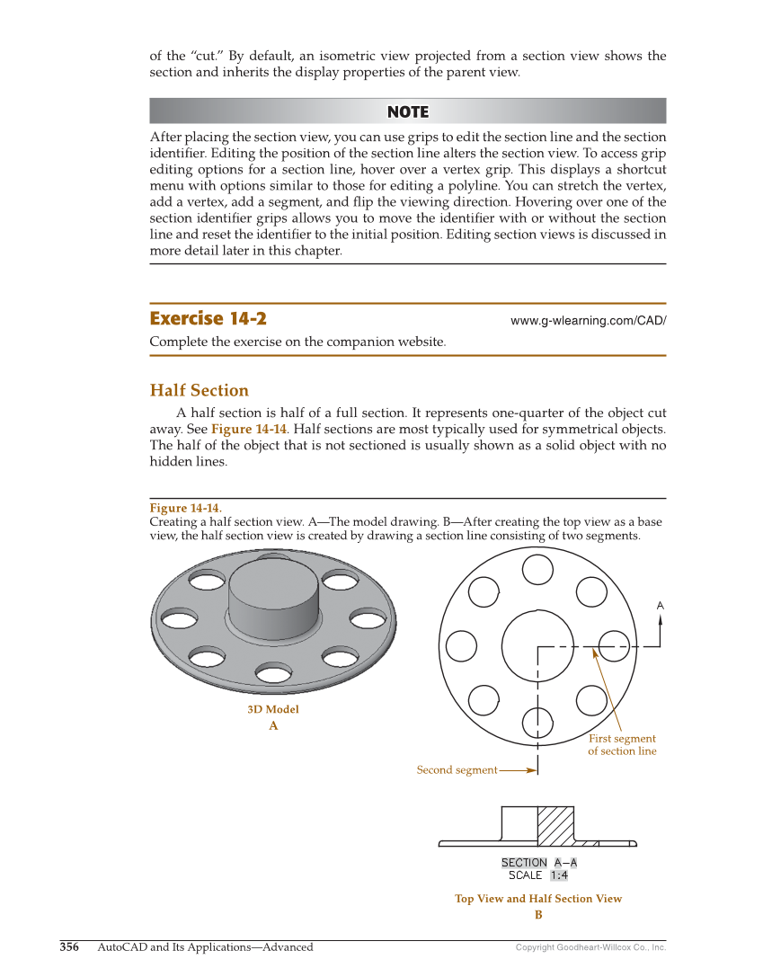 Copyright Goodheart-Willcox Co., Inc. 356 AutoCAD and Its Applications—Advanced of the “cut.” By default, an isometric view projected from a section view shows the section and inherits the display properties of the parent view. NOTE NOTE After placing the section view, you can use grips to edit the section line and the section identifi er. Editing the position of the section line alters the section view. To access grip editing options for a section line, hover over a vertex grip. This displays a shortcut menu with options similar to those for editing a polyline. You can stretch the vertex, add a vertex, add a segment, and fl ip the viewing direction. Hovering over one of the section identifi er grips allows you to move the identifi er with or without the section line and reset the identifi er to the initial position. Editing section views is discussed in more detail later in this chapter. Exercise 14-2 www.g-wlearning.com/CAD/ Complete the exercise on the companion website. Half Section A half section is half of a full section. It represents one-quarter of the object cut away. See Figure 14-14. Half sections are most typically used for symmetrical objects. The half of the object that is not sectioned is usually shown as a solid object with no hidden lines. 3D Model A Top View and Half Section View B First segment of section line Second segment Figure 14-14. Creating a half section view. A—The model drawing. B—After creating the top view as a base view, the half section view is created by drawing a section line consisting of two segments.
