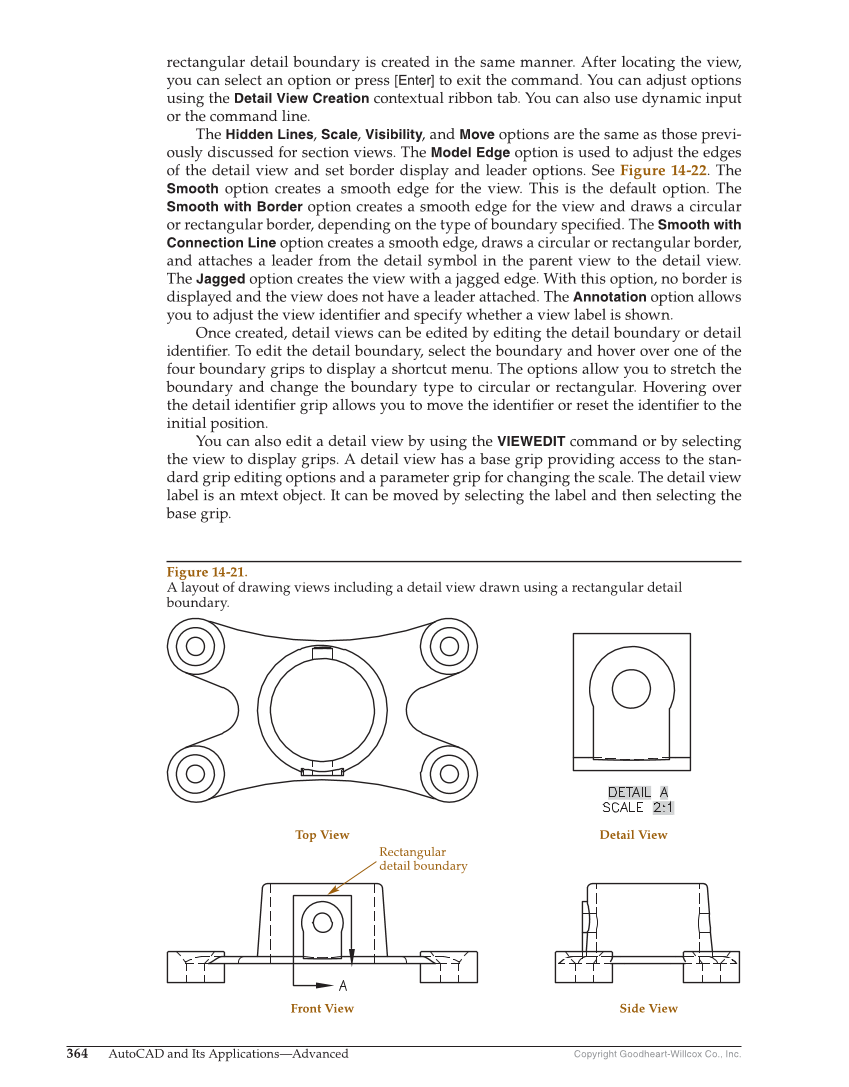 Copyright Goodheart-Willcox Co., Inc. 364 AutoCAD and Its Applications—Advanced rectangular detail boundary is created in the same manner. After locating the view, you can select an option or press [Enter] to exit the command. You can adjust options using the Detail View Creation contextual ribbon tab. You can also use dynamic input or the command line. The Hidden Lines, Scale, Visibility, and Move options are the same as those previ- ously discussed for section views. The Model Edge option is used to adjust the edges of the detail view and set border display and leader options. See Figure 14-22. The Smooth option creates a smooth edge for the view. This is the default option. The Smooth with Border option creates a smooth edge for the view and draws a circular or rectangular border, depending on the type of boundary specifi ed. The Smooth with Connection Line option creates a smooth edge, draws a circular or rectangular border, and attaches a leader from the detail symbol in the parent view to the detail view. The Jagged option creates the view with a jagged edge. With this option, no border is displayed and the view does not have a leader attached. The Annotation option allows you to adjust the view identifi er and specify whether a view label is shown. Once created, detail views can be edited by editing the detail boundary or detail identifi er. To edit the detail boundary, select the boundary and hover over one of the four boundary grips to display a shortcut menu. The options allow you to stretch the boundary and change the boundary type to circular or rectangular. Hovering over the detail identifi er grip allows you to move the identifi er or reset the identifi er to the initial position. You can also edit a detail view by using the VIEWEDIT command or by selecting the view to display grips. A detail view has a base grip providing access to the stan- dard grip editing options and a parameter grip for changing the scale. The detail view label is an mtext object. It can be moved by selecting the label and then selecting the base grip. Top View Front View Detail View Side View Rectangular detail boundary Figure 14-21. A layout of drawing views including a detail view drawn using a rectangular detail boundary.