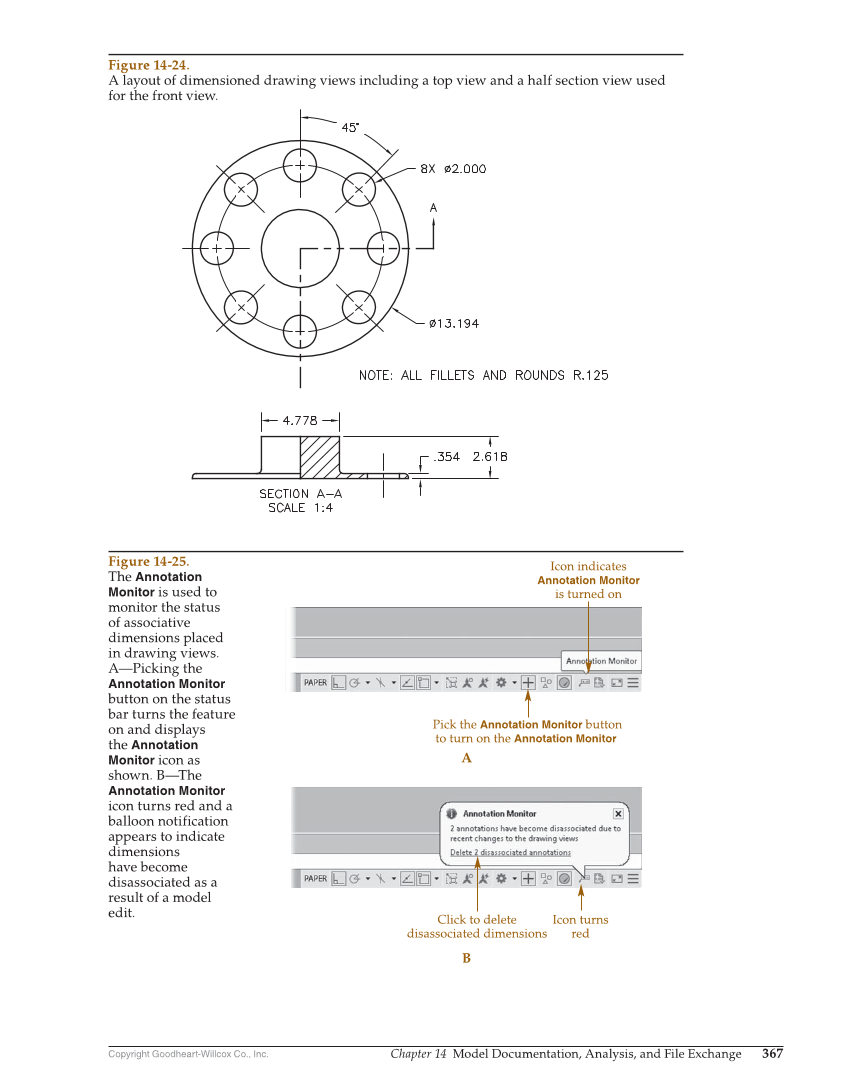 Copyright Goodheart-Willcox Co., Inc. Chapter 14 Model Documentation, Analysis, and File Exchange 367 Figure 14-24. A layout of dimensioned drawing views including a top view and a half section view used for the front view. Figure 14-25. The Annotation Monitor is used to monitor the status of associative dimensions placed in drawing views. A—Picking the Annotation Monitor button on the status bar turns the feature on and displays the Annotation Monitor icon as shown. B—The Annotation Monitor icon turns red and a balloon notification appears to indicate dimensions have become disassociated as a result of a model edit. Pick the Annotation Monitor button to turn on the Annotation Monitor Click to delete disassociated dimensions Icon turns red Icon indicates Annotation Monitor is turned on A B
