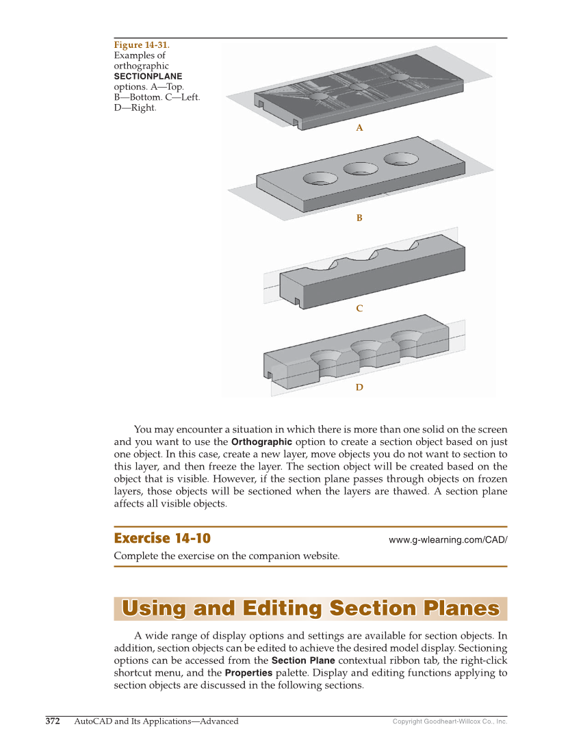 Copyright Goodheart-Willcox Co., Inc. 372 AutoCAD and Its Applications—Advanced You may encounter a situation in which there is more than one solid on the screen and you want to use the Orthographic option to create a section object based on just one object. In this case, create a new layer, move objects you do not want to section to this layer, and then freeze the layer. The section object will be created based on the object that is visible. However, if the section plane passes through objects on frozen layers, those objects will be sectioned when the layers are thawed. A section plane affects all visible objects. Exercise 14-10 www.g-wlearning.com/CAD/ Complete the exercise on the companion website. Using and Editing Section Planes Using and Editing Section Planes A wide range of display options and settings are available for section objects. In addition, section objects can be edited to achieve the desired model display. Sectioning options can be accessed from the Section Plane contextual ribbon tab, the right-click shortcut menu, and the Properties palette. Display and editing functions applying to section objects are discussed in the following sections. A B C D Figure 14-31. Examples of orthographic SECTIONPLANE options. A—Top. B—Bottom. C—Left. D—Right.